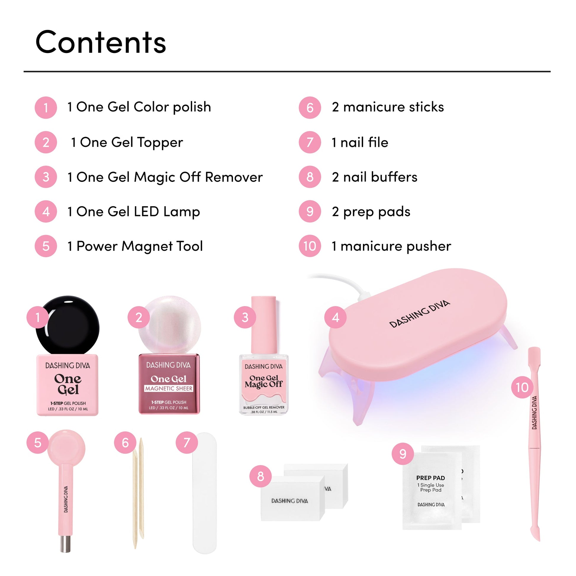All cat-eyes on you. This bundle features a rich 1-step black gel nail polish that delivers a flawless all-in-one base, color, and topcoat for a salon gel shine—easily set with the included LED lamp. Layer on iridescent moments with a 1-step sheer iridescent silver glitter gel polish that starts off shimmery and transforms into a magnetic finish once activated with our magnet tool.