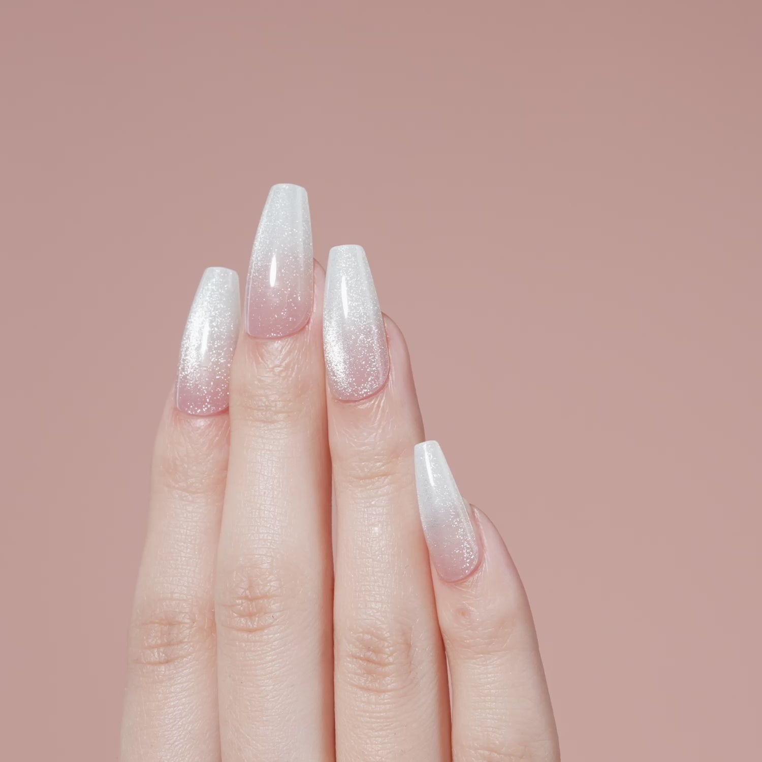 Long length, coffin shape, glossy finish. Baby pink glue-on gel nails featuring ombré white tips and a shimmery velvet effect.