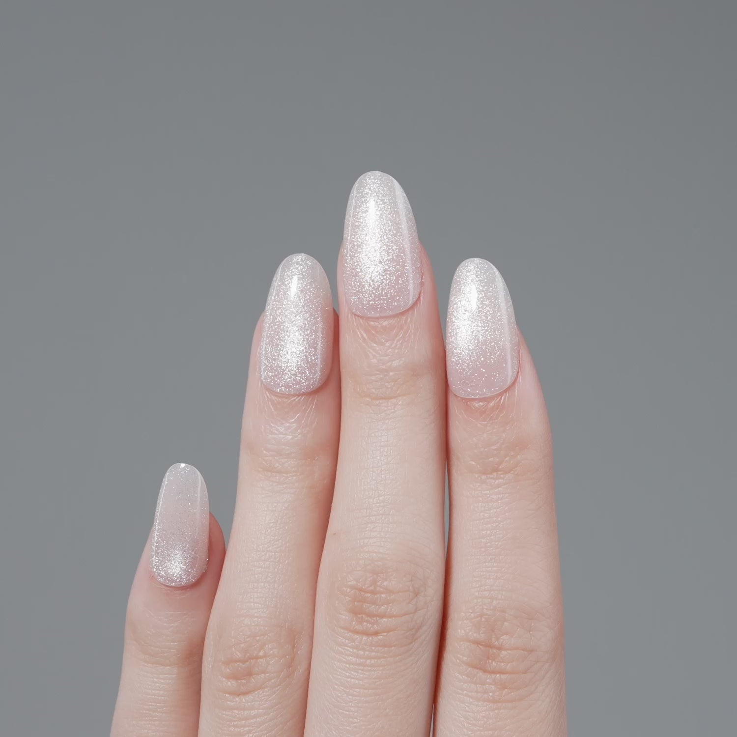 Medium length, round shape, glossy finish. Soft nude pink glue-on gel nails featuring a shimmery velvet effect.