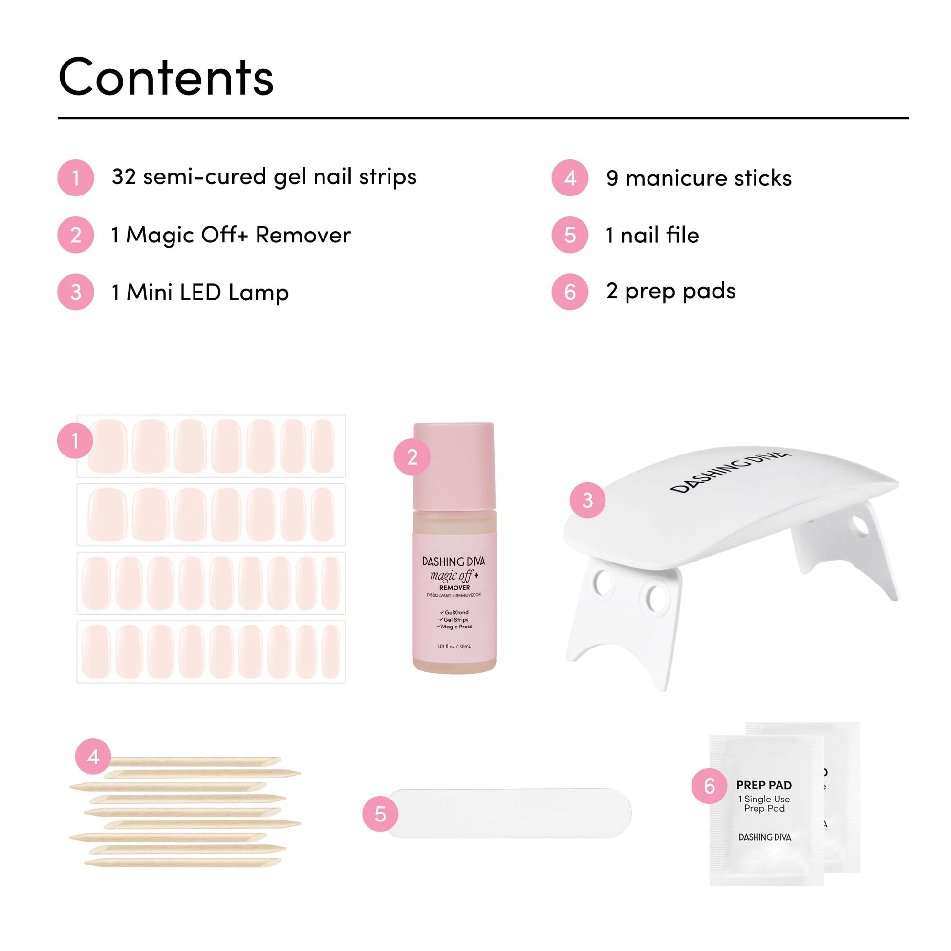 Bundle features a semi-cured nude peach gel nail strips with mega volume and maximum shine—easily set with the included LED lamp. When it’s time for a change, use Magic Off+ Remover to safely remove your strips while nourishing and strengthening your nails.