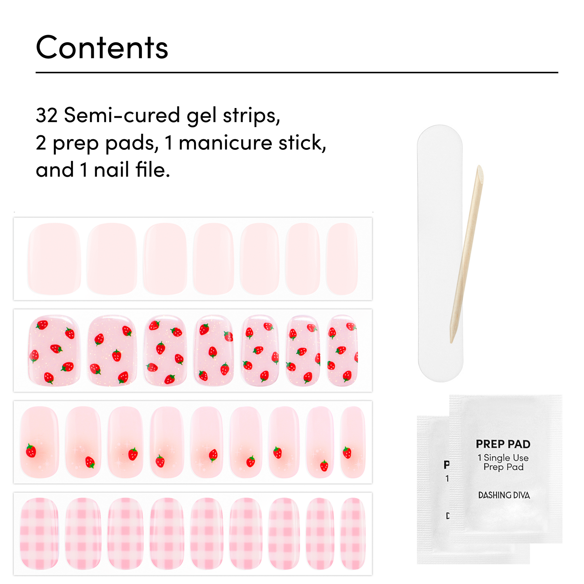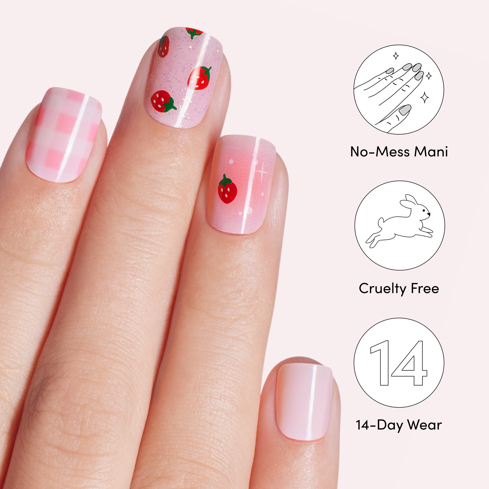 Wait… Is this a date?! Semi-cured baby pink gel nail strips featuring strawberries, checkered print, iridescent glitter, and aura accents with mega volume and maximum shine.