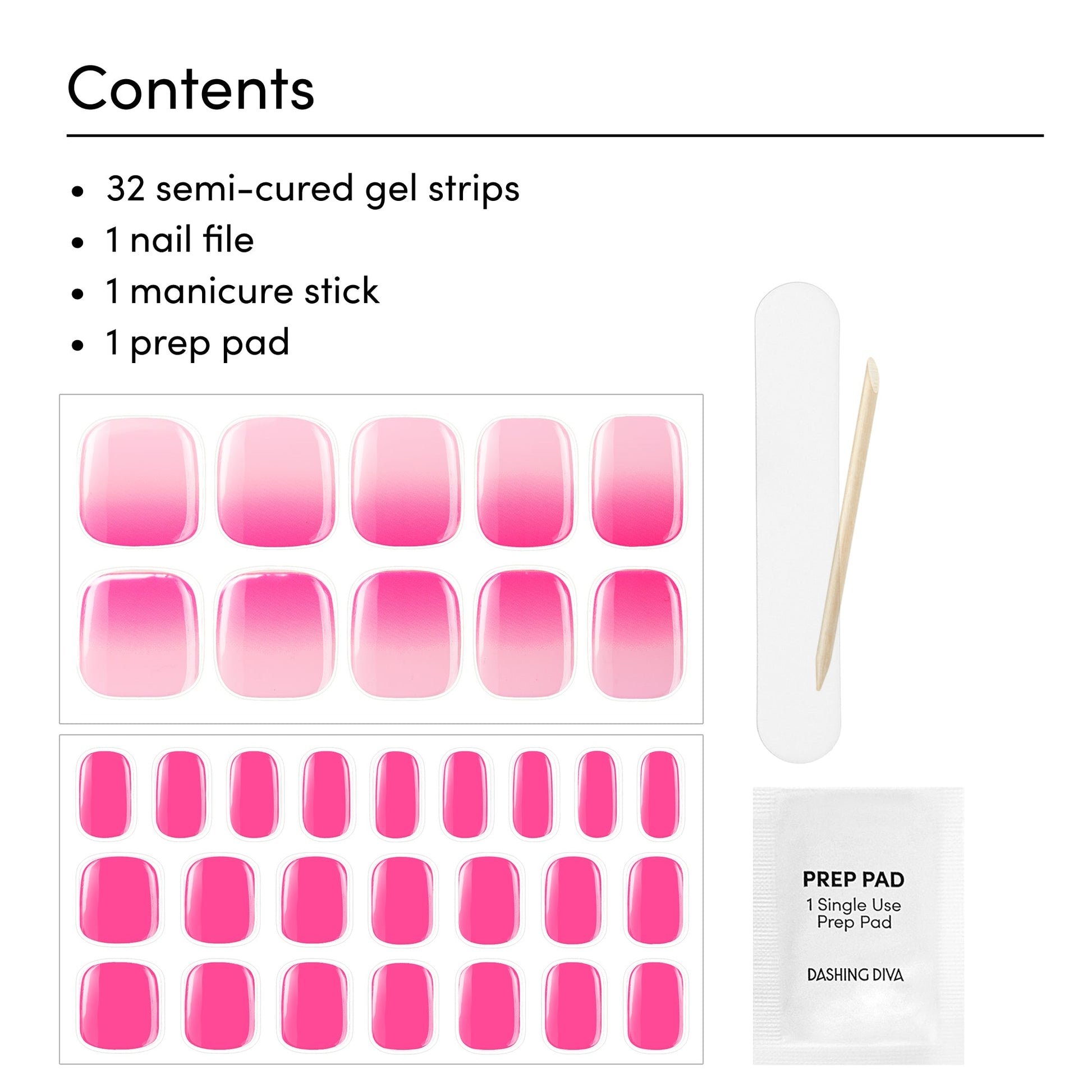 Semi-cured gradient hot pink to light pink gel nail strips with mega volume and maximum shine.