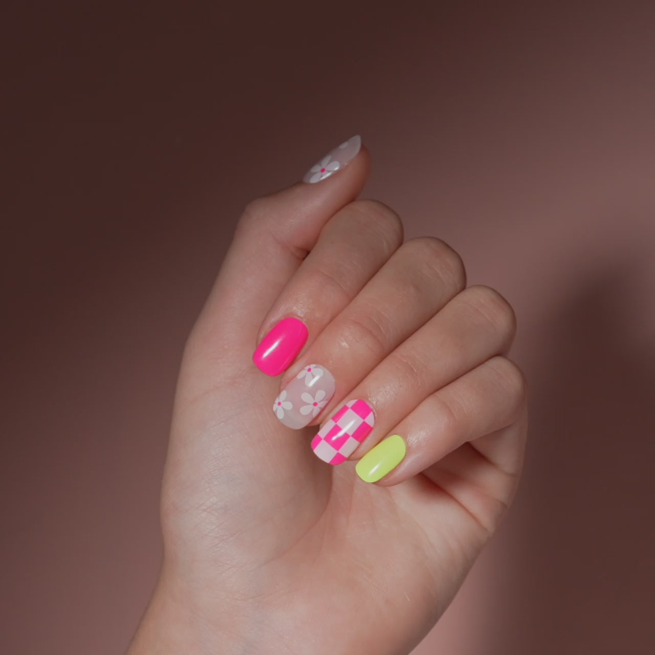 MISS MATCHED: A mix of hot pink, light pink, and white designs in a natural squoval shape.