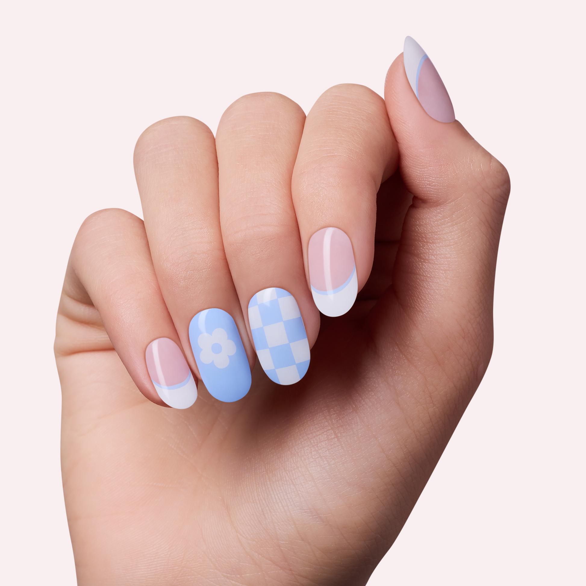 CHILL OUT: A mix n match periwinkle & white mani in a natural round shape.