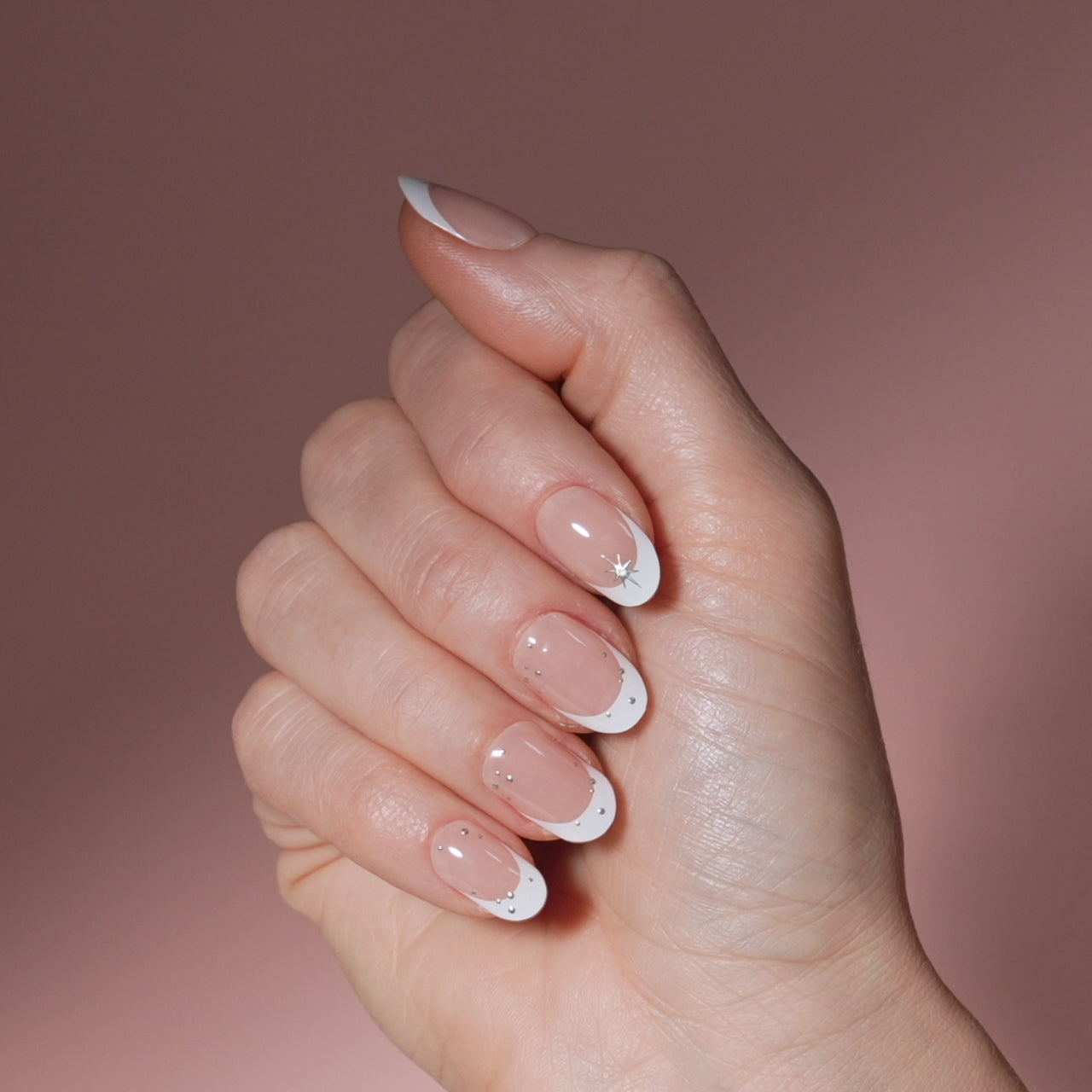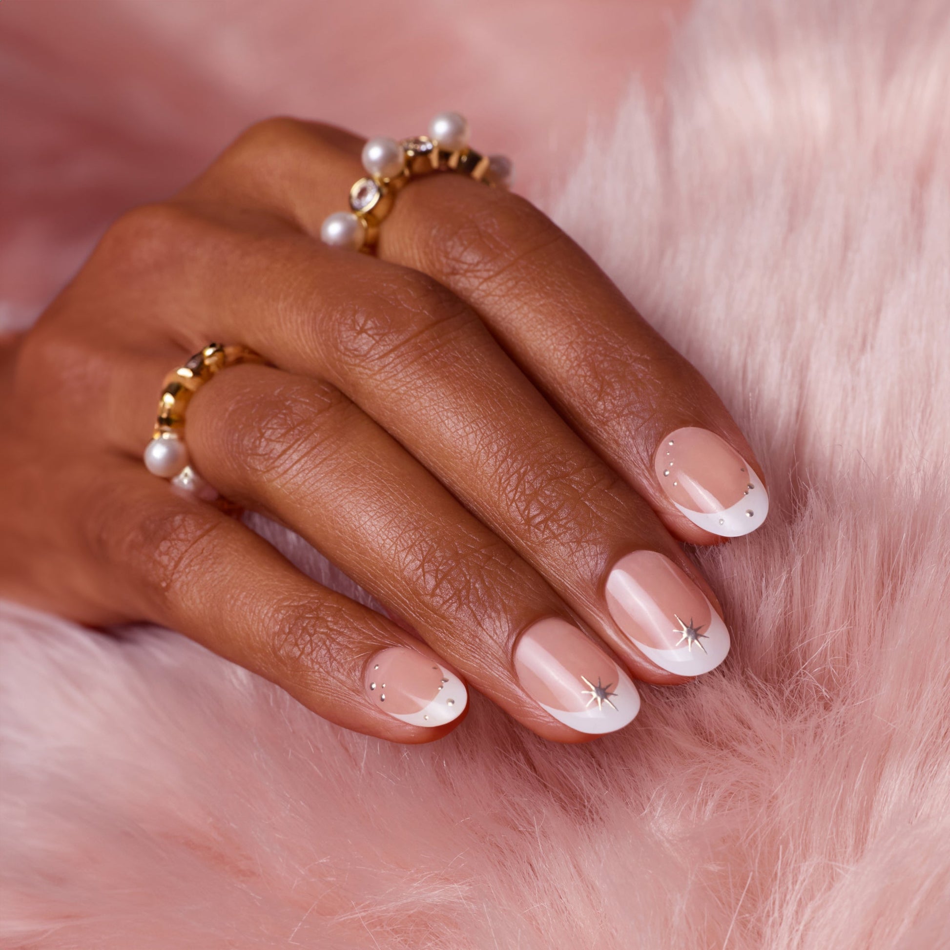 A classic french mani with gold starry accents in a natural round shape.