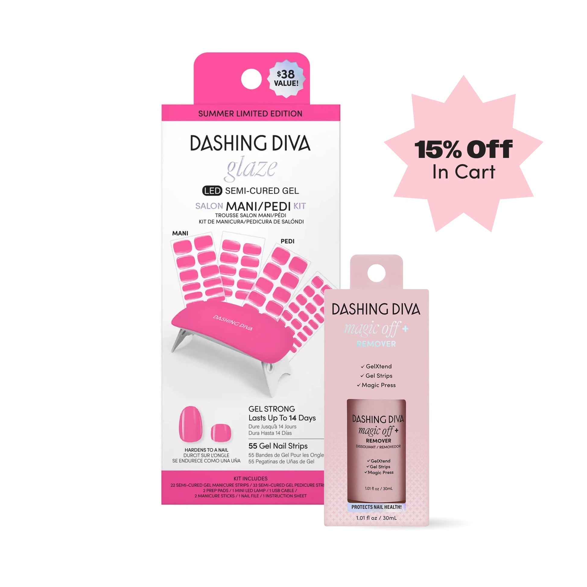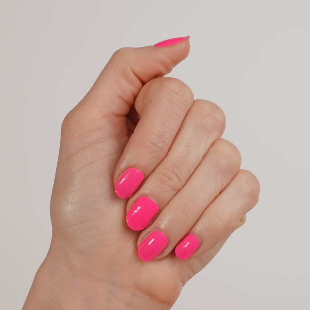 Bundle features a matching mani/pedi set of semi-cured hot pink gel nail strips with mega volume and maximum shine—easily set with the included LED lamp. When it’s time for a change, use Magic Off+ Remover to safely remove your strips while nourishing and strengthening your nails.