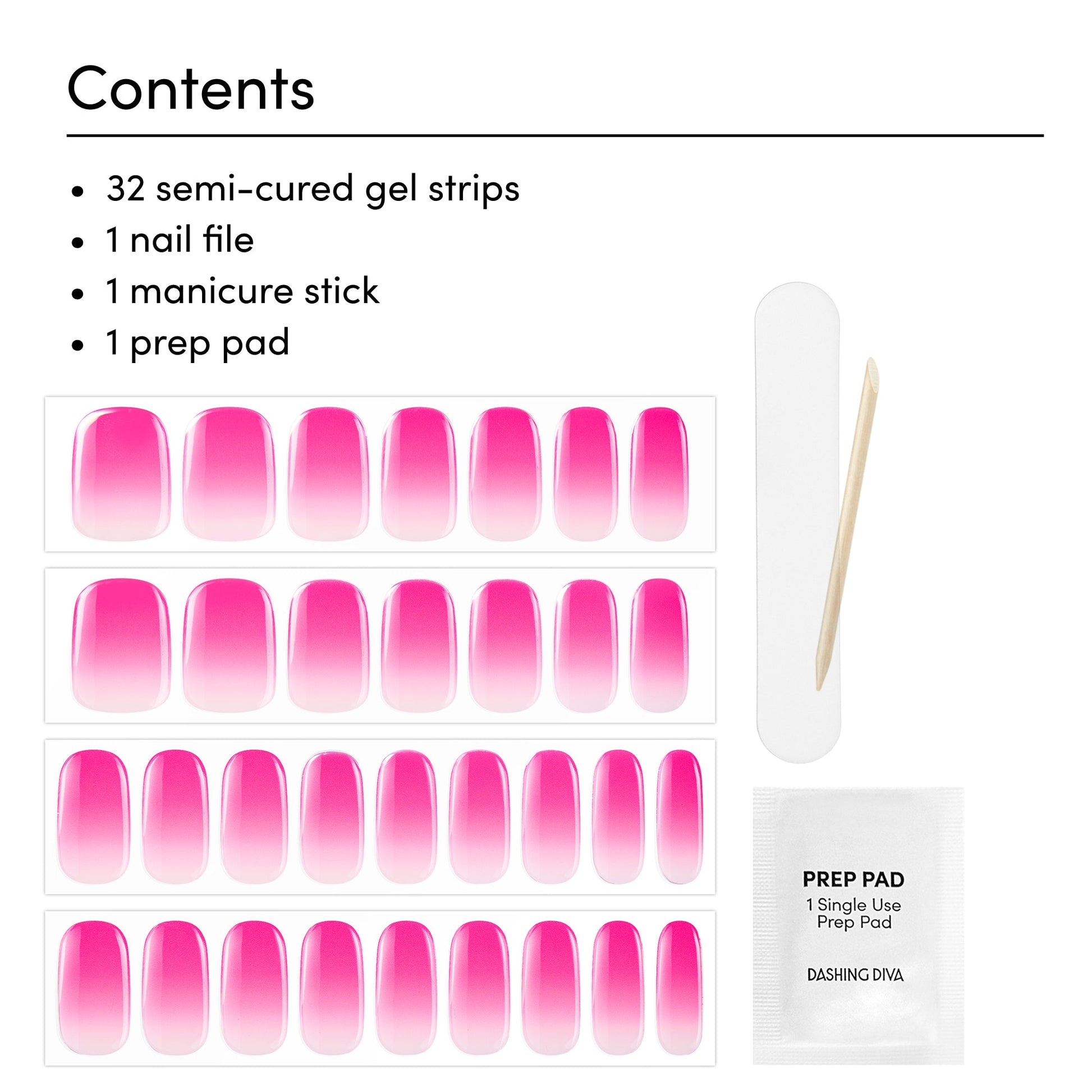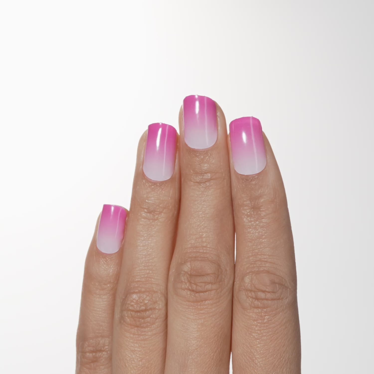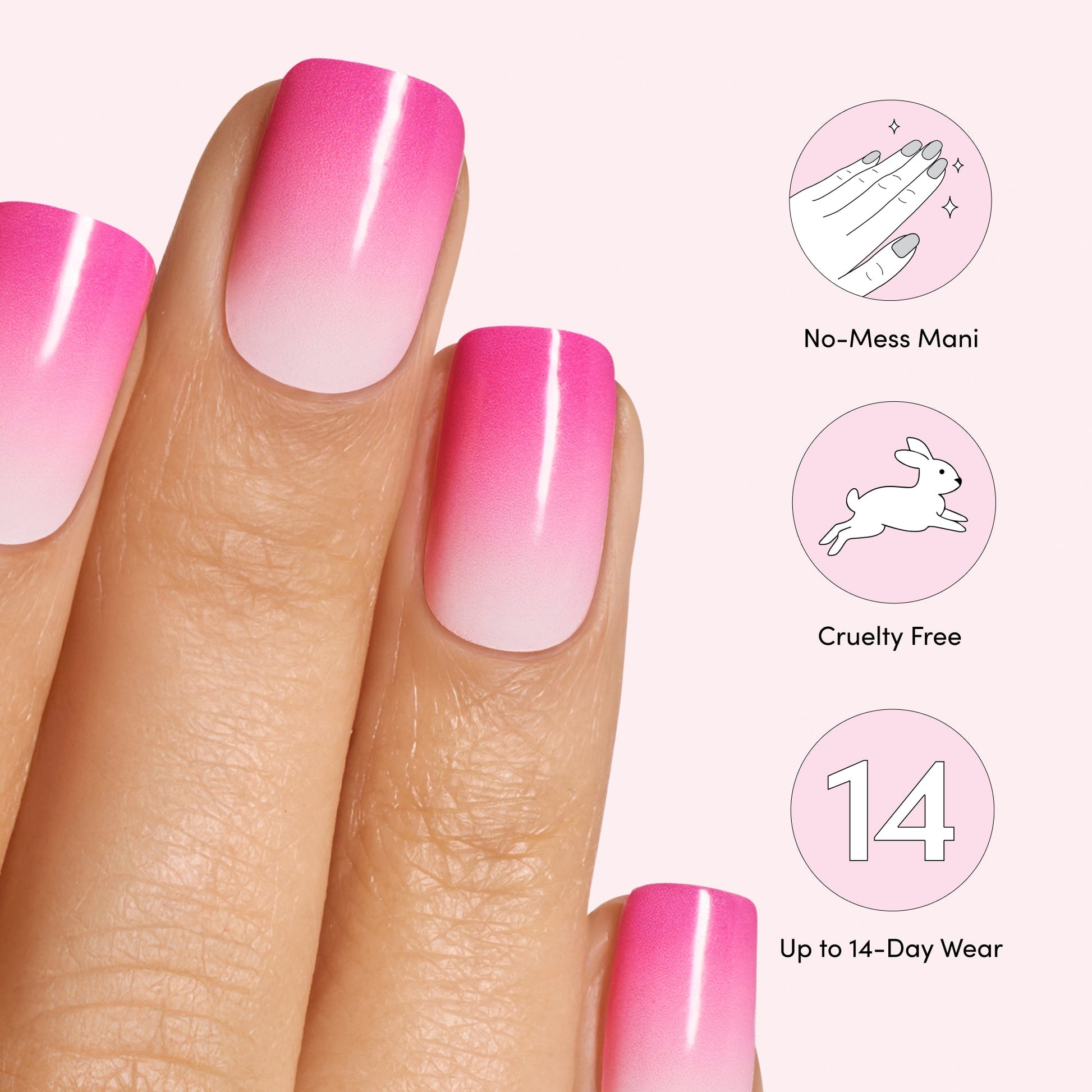 Semi-cured true pink ombré gel nail strips with mega volume and maximum shine.