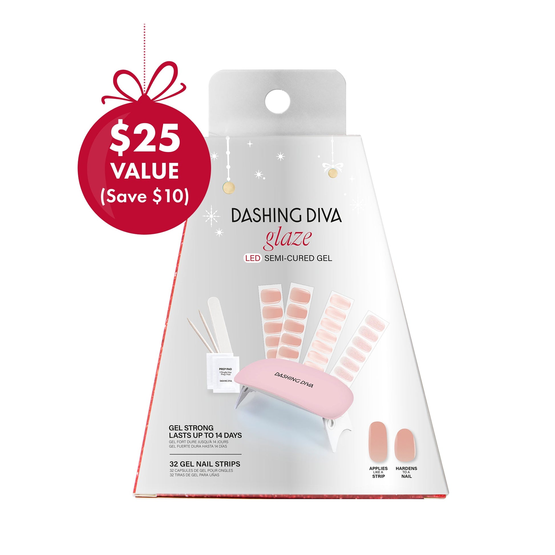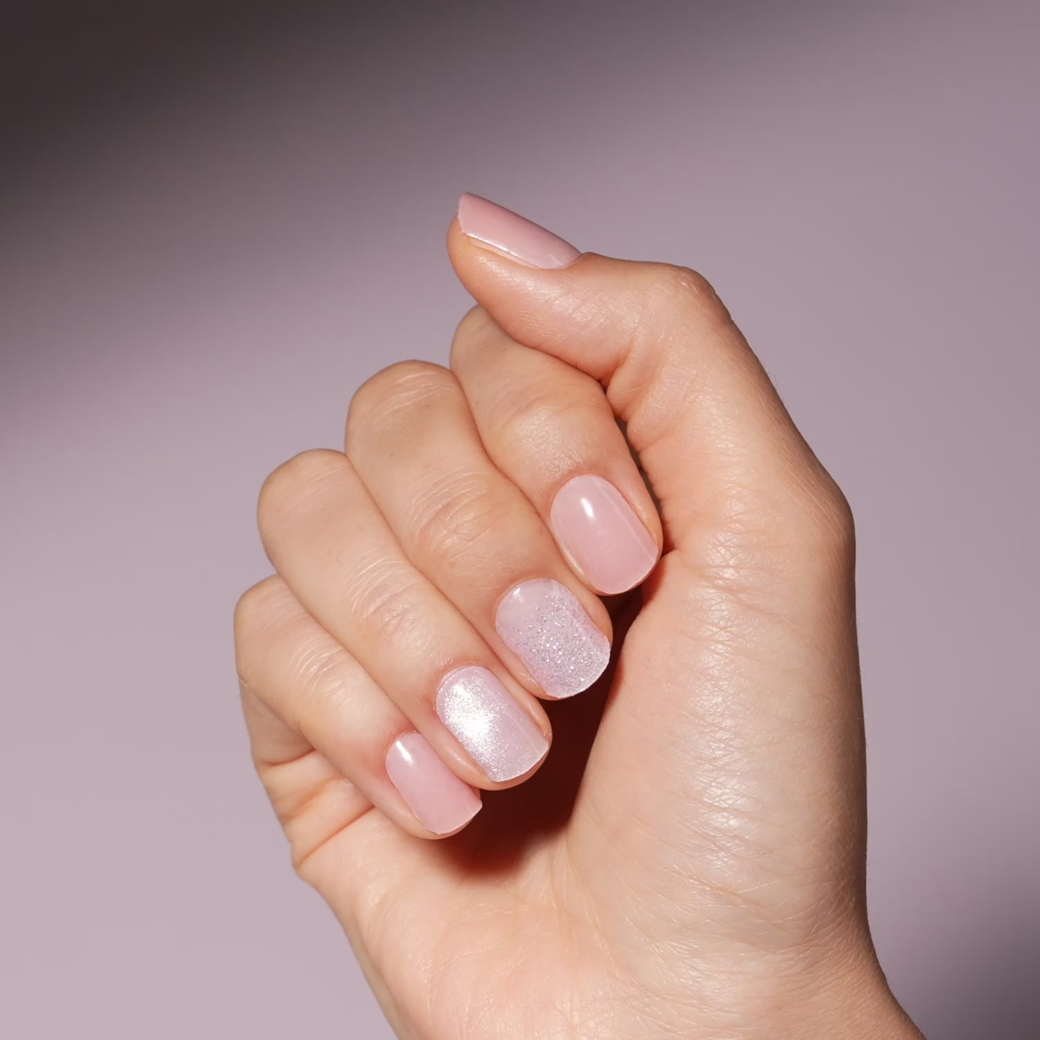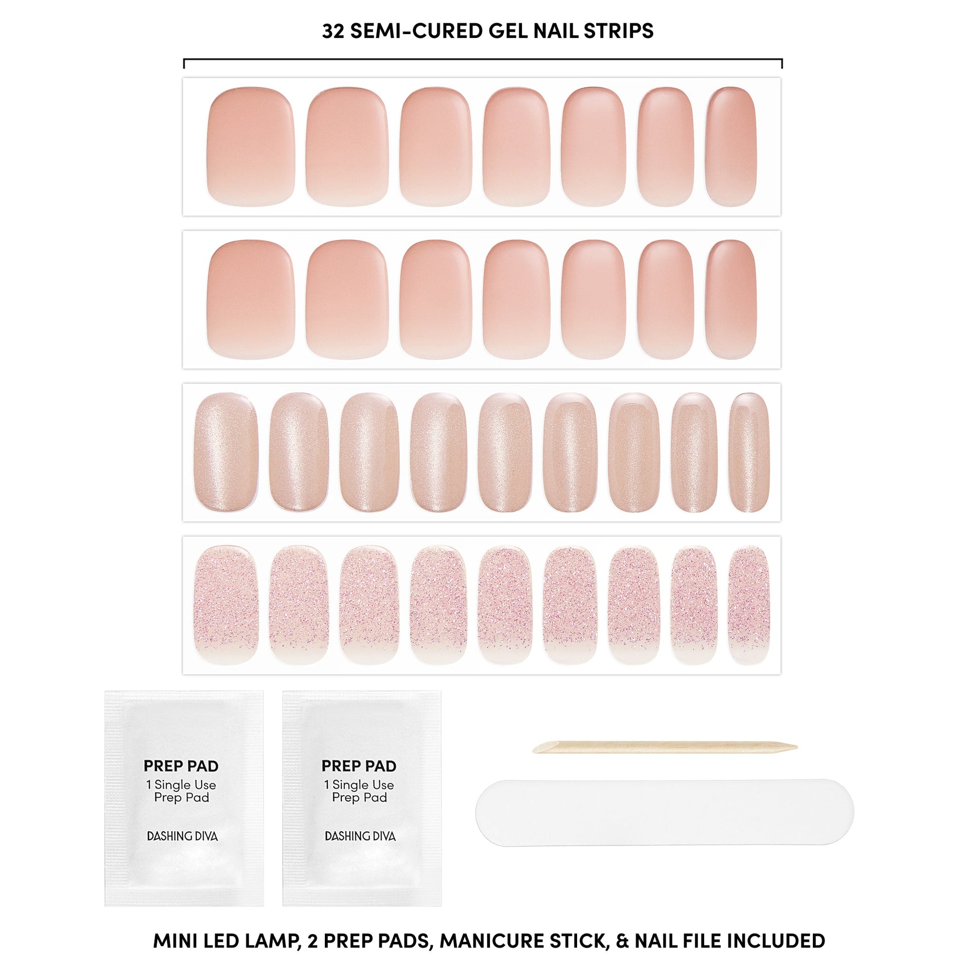 That lit-from-within romantic glow. Semi-cured nude and barely there pink gel nail strips with mega volume and maximum shine. A kit to fall in love with.