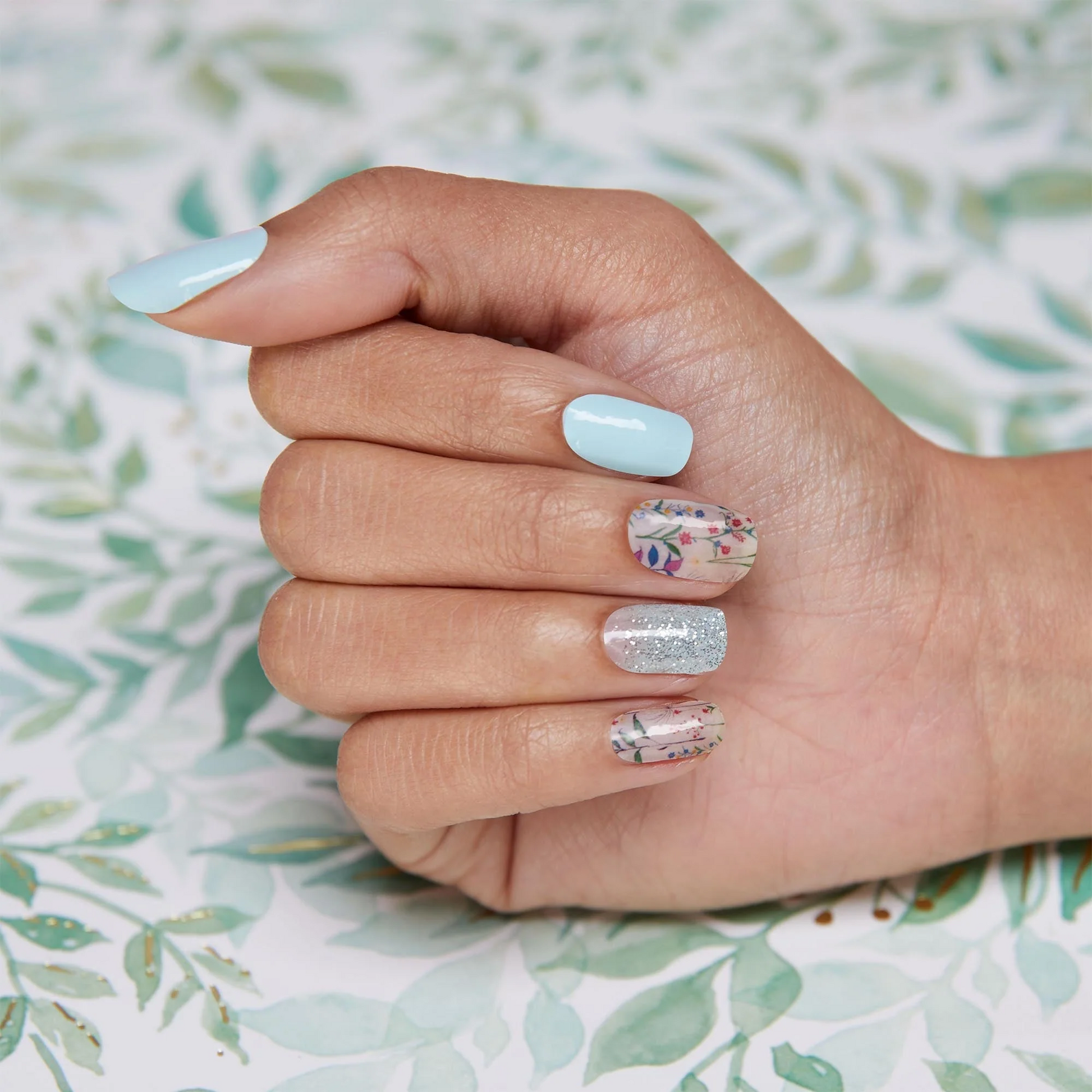Turquoise gel nail strips featuring turquoise & champagne glitter and pressed flower accents with a glossy, high-shine finish.