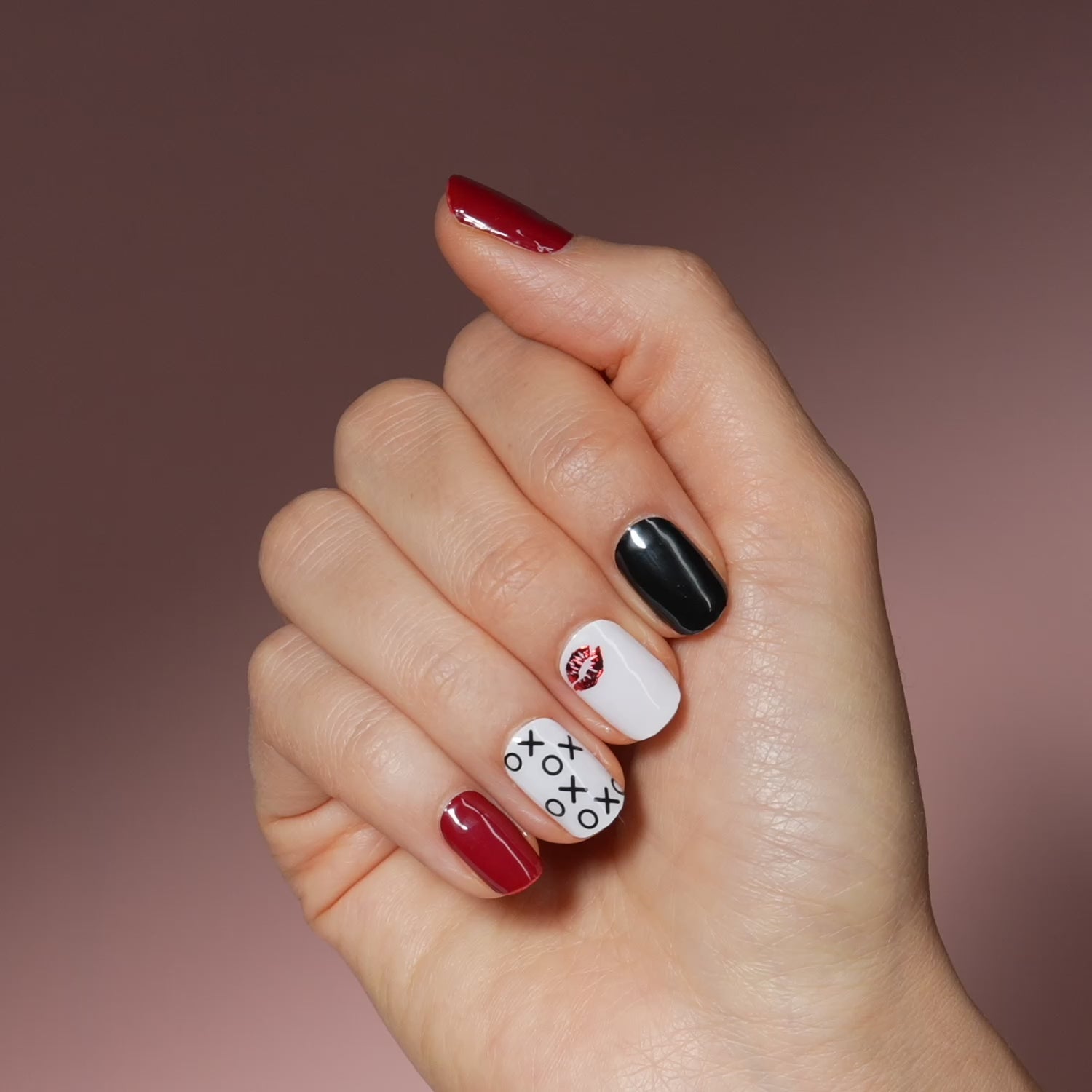 What's black and white and red all over? Your new mani obsession. Lipstick red, midnight black, and XO designs mix it up in these gel nail strips with a glossy, high-shine finish.