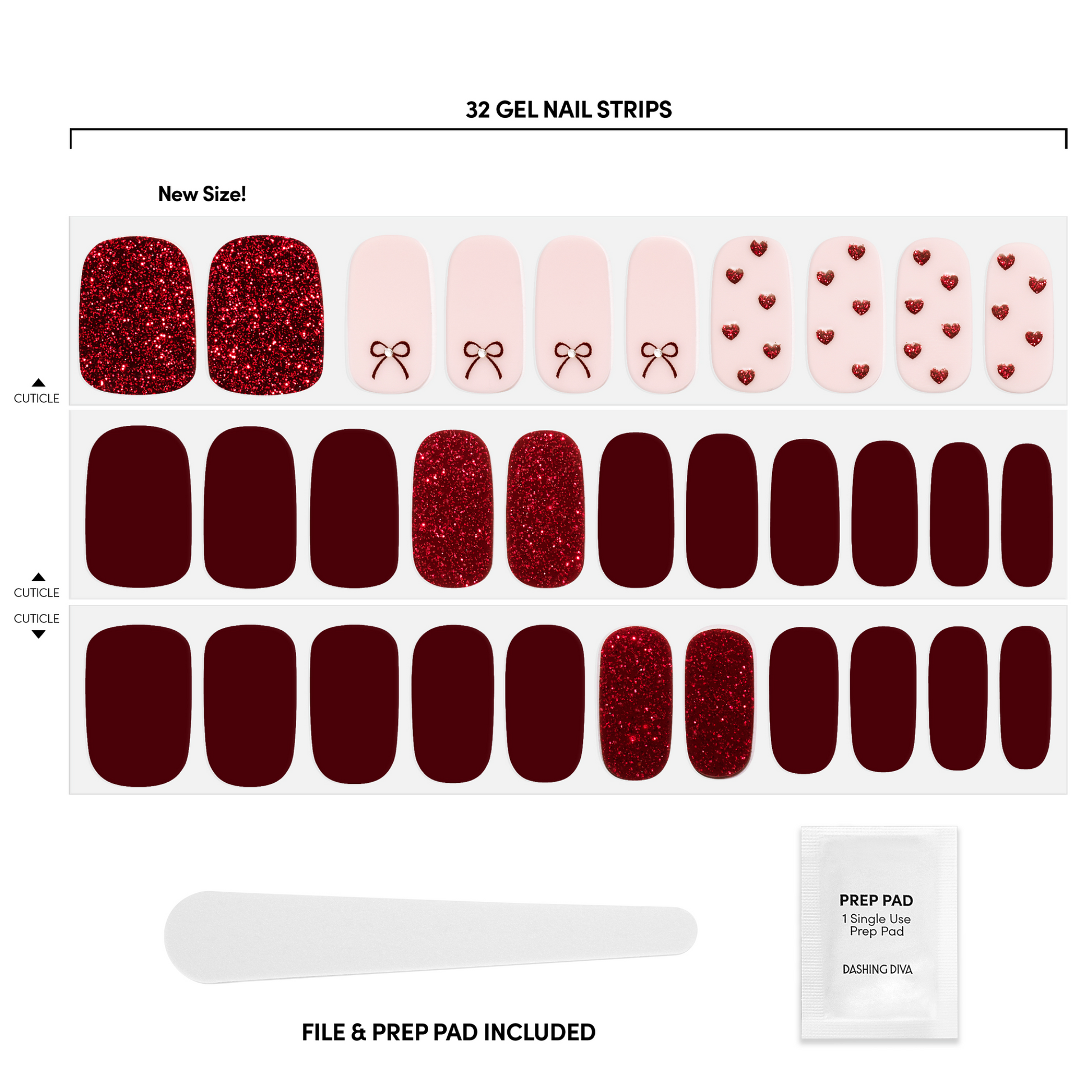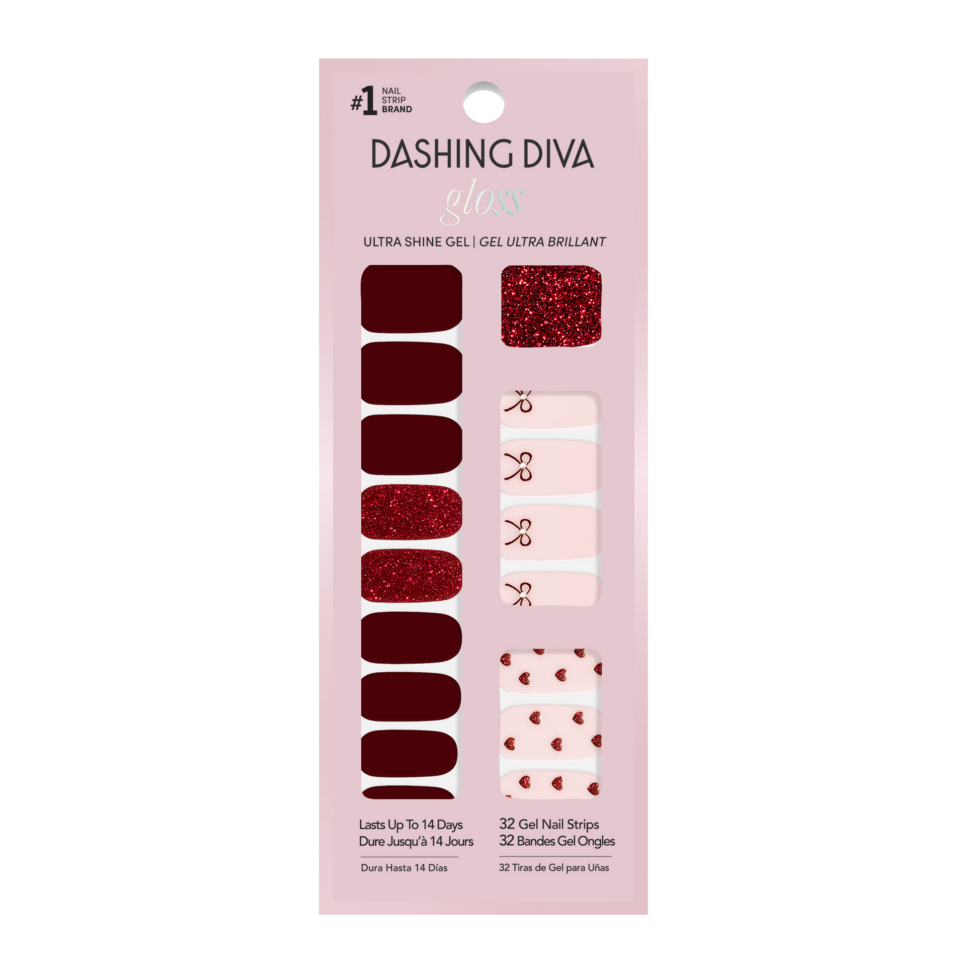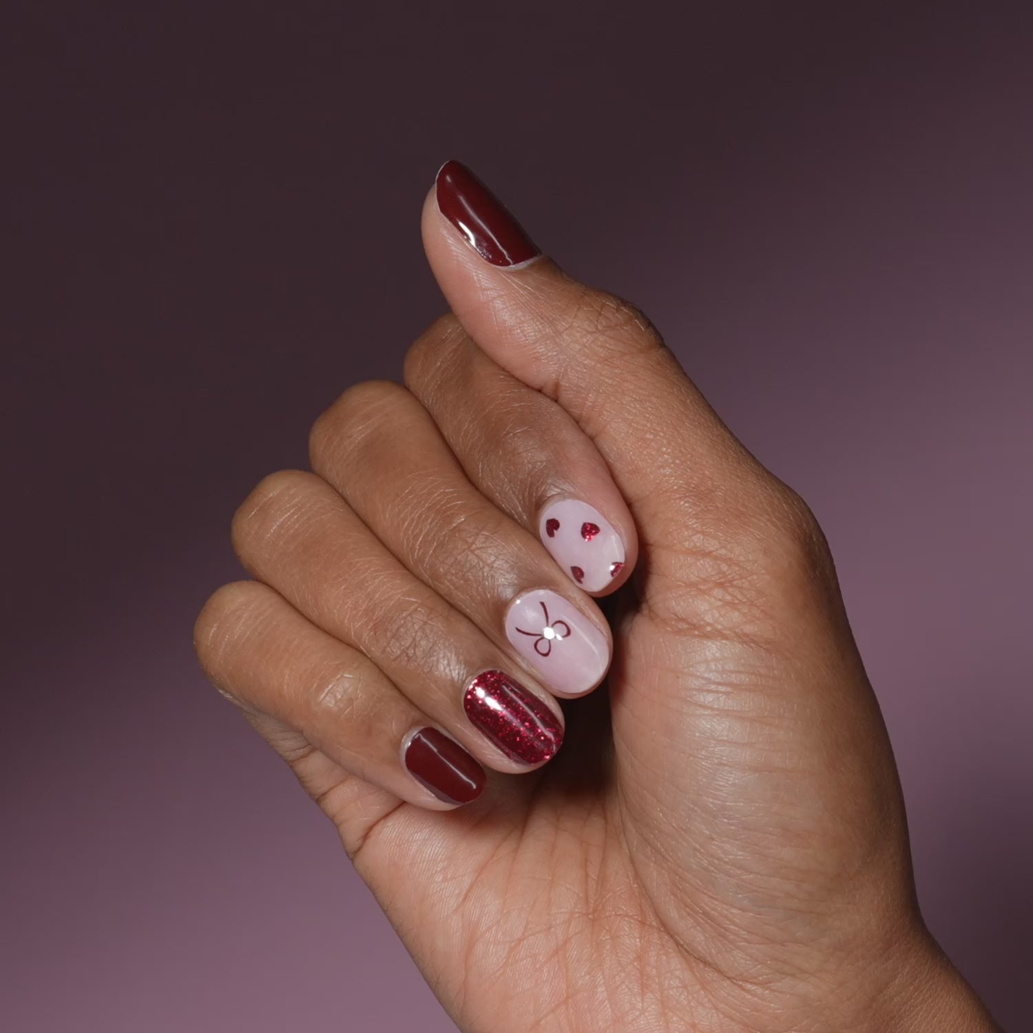 Bows, hearts, and all the sweetest things. Maroon and light pink designs mix it up in these gel nail strips with a glossy, high-shine finish.