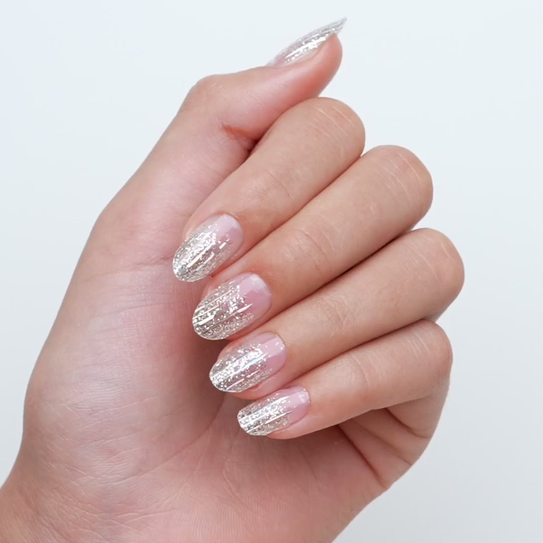 Topping the charts and coming in hot at #1. Sheer silver gel nail strips featuring iridescent silver glitter and party streamer accents with a glossy, high-shine finish.