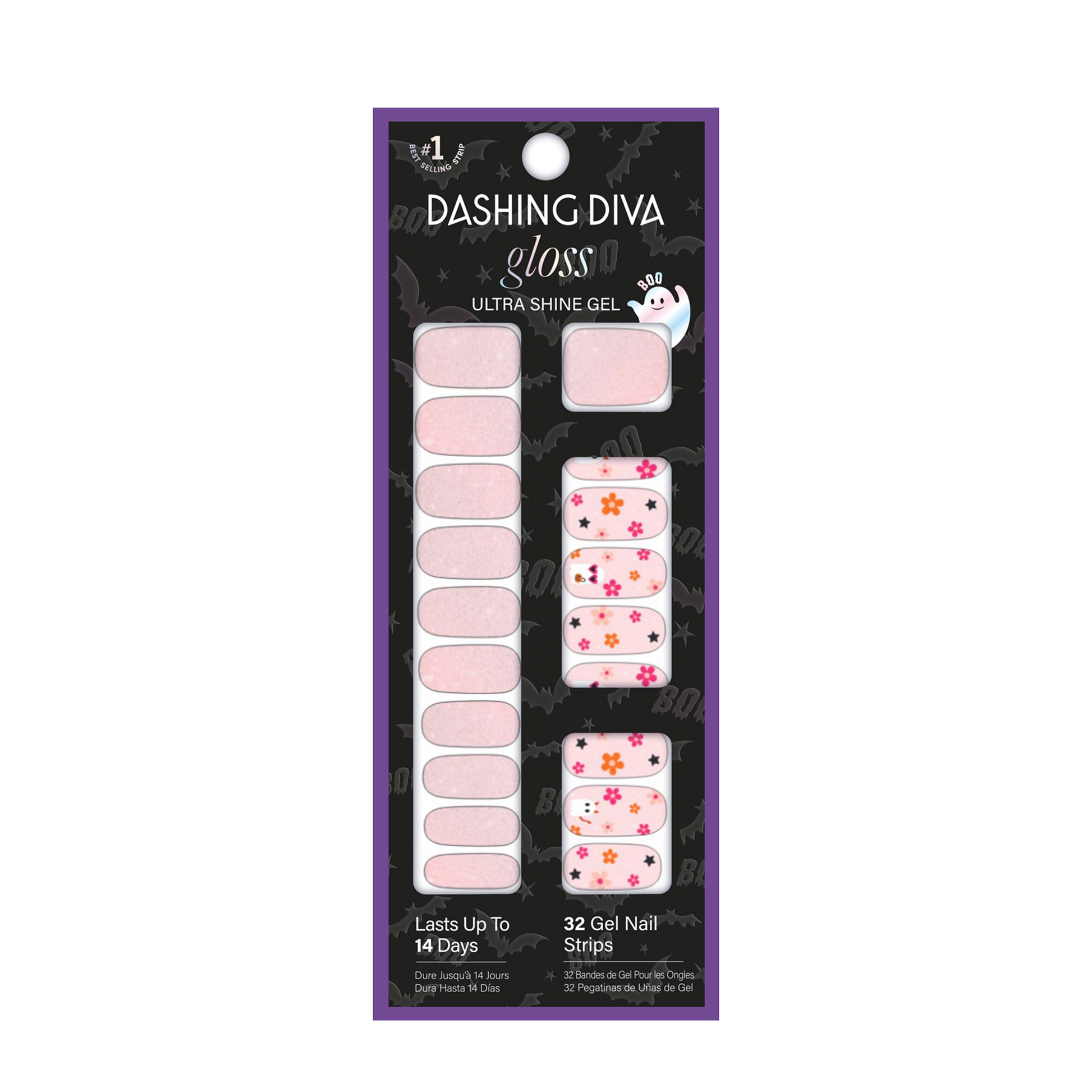 Ghouls just wanna have fun, you know. Solid & shimmery nude pink gel nail strips featuring ghosts, flowers, and stars with a glossy, high-shine finish.