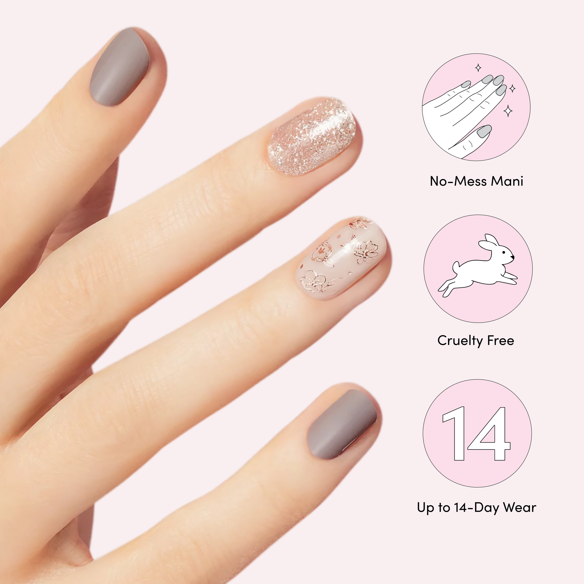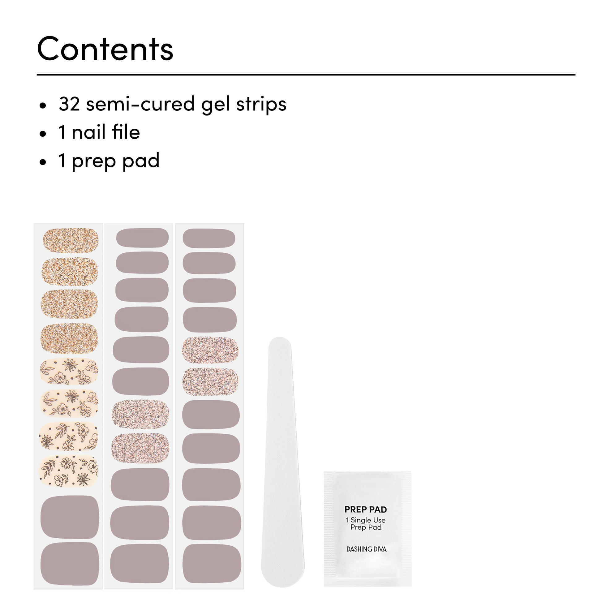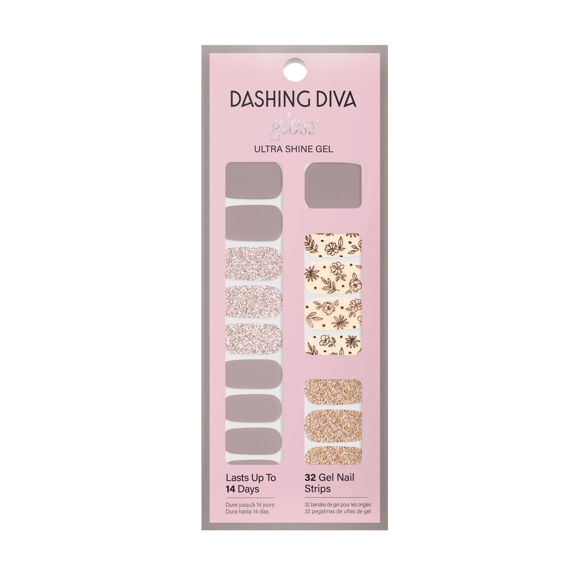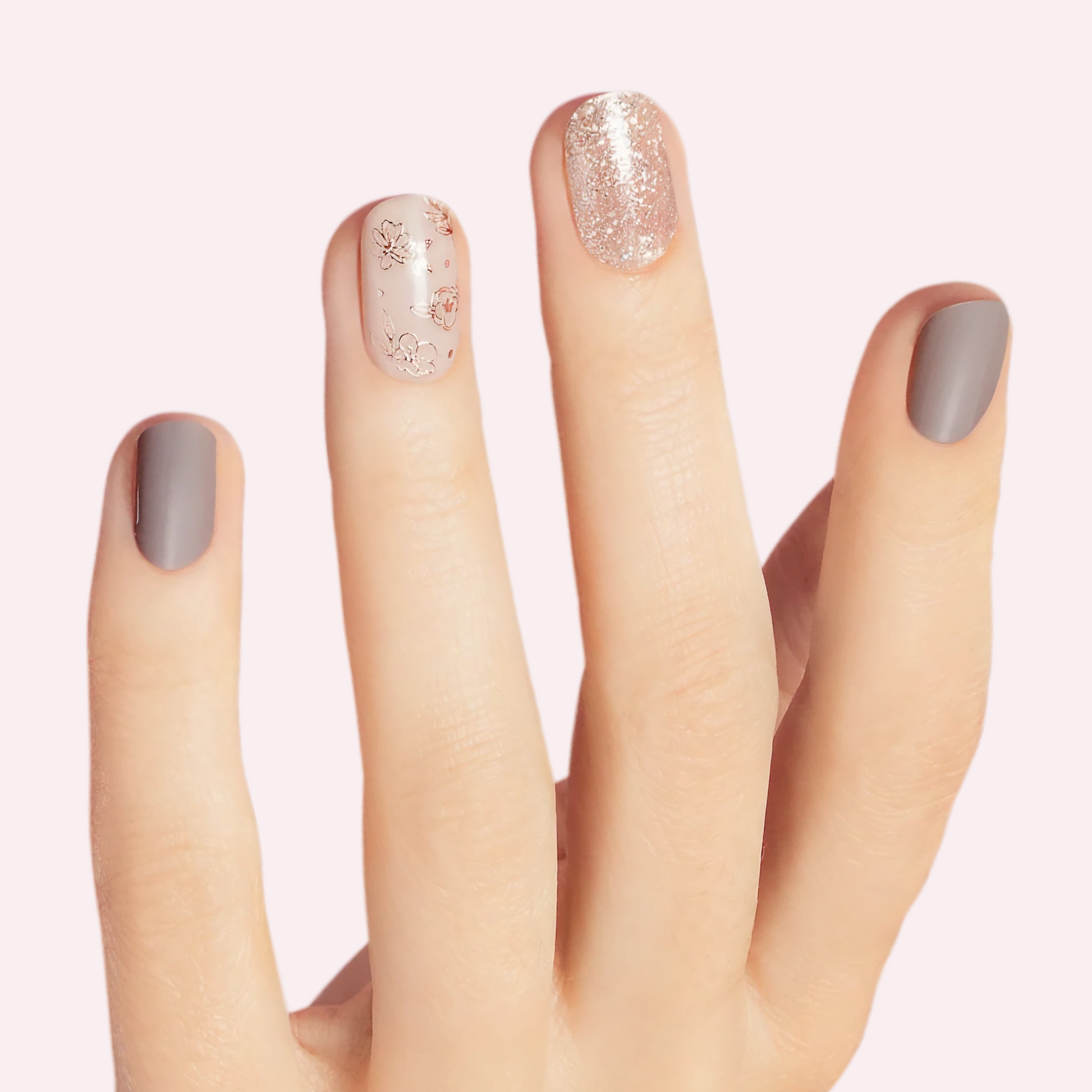 Gray & ivory gel nail strips featuring gold glitter, rose gold glitter, and metallic floral accents with a glossy, high-shine finish.