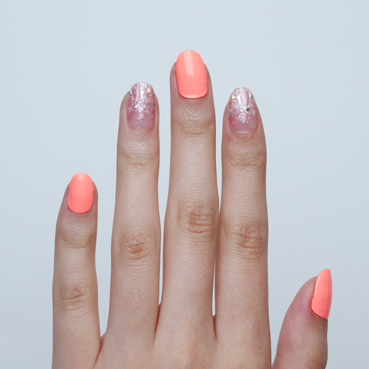 Clear & peach gel nail strips featuring iridescent glitter and seashell accents with a glossy, high-shine finish.