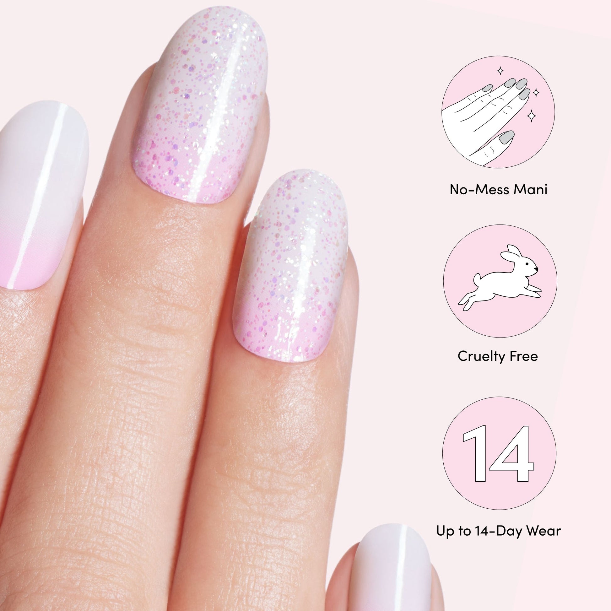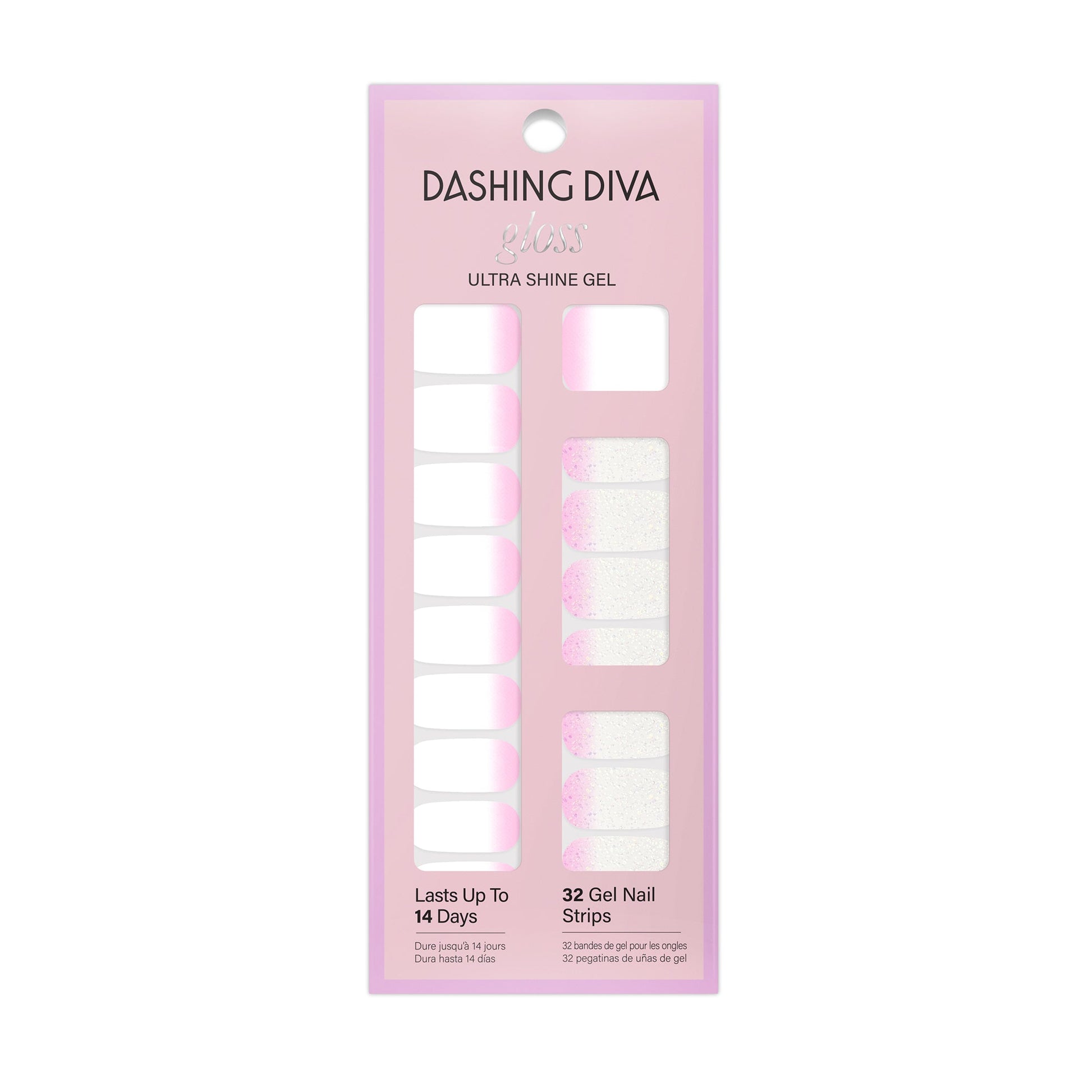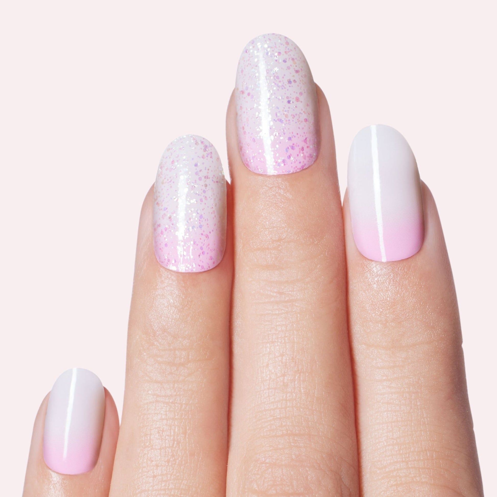 Pink to white ombré gel nail strips featuring iridescent glitter with a glossy, high-shine finish.