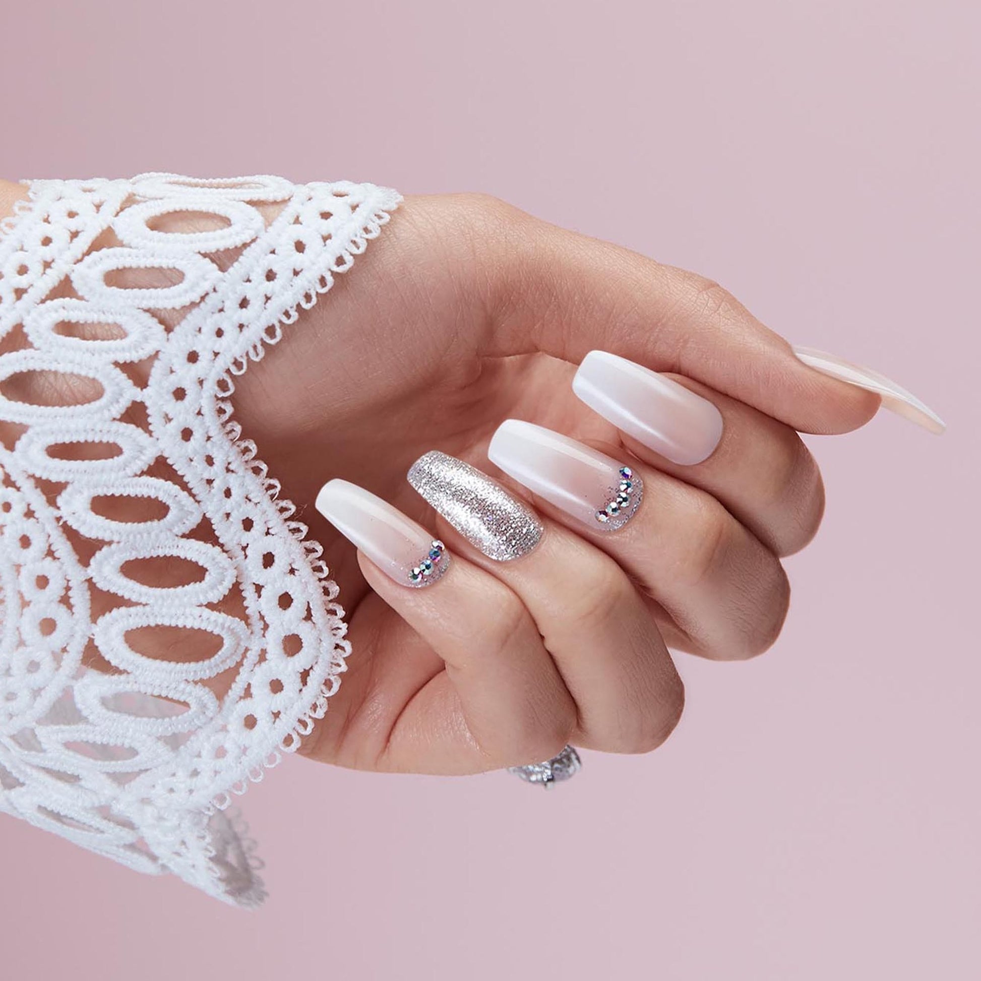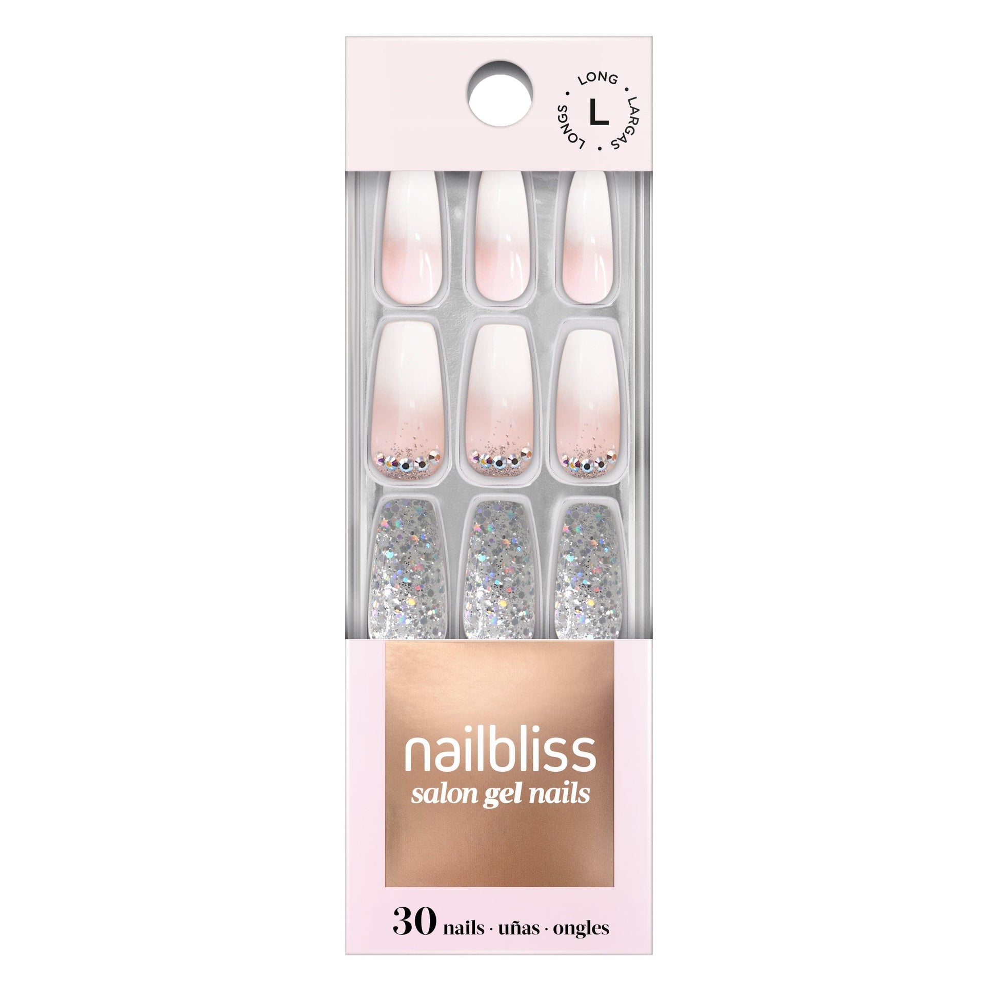 That length and that bling shows that you're here to slay. Long length, coffin shape, glossy finish nude pink glue-on gel nails featuring ombré French tips, rhinestones, and iridescent confetti glitter with salon strength & professional shine.