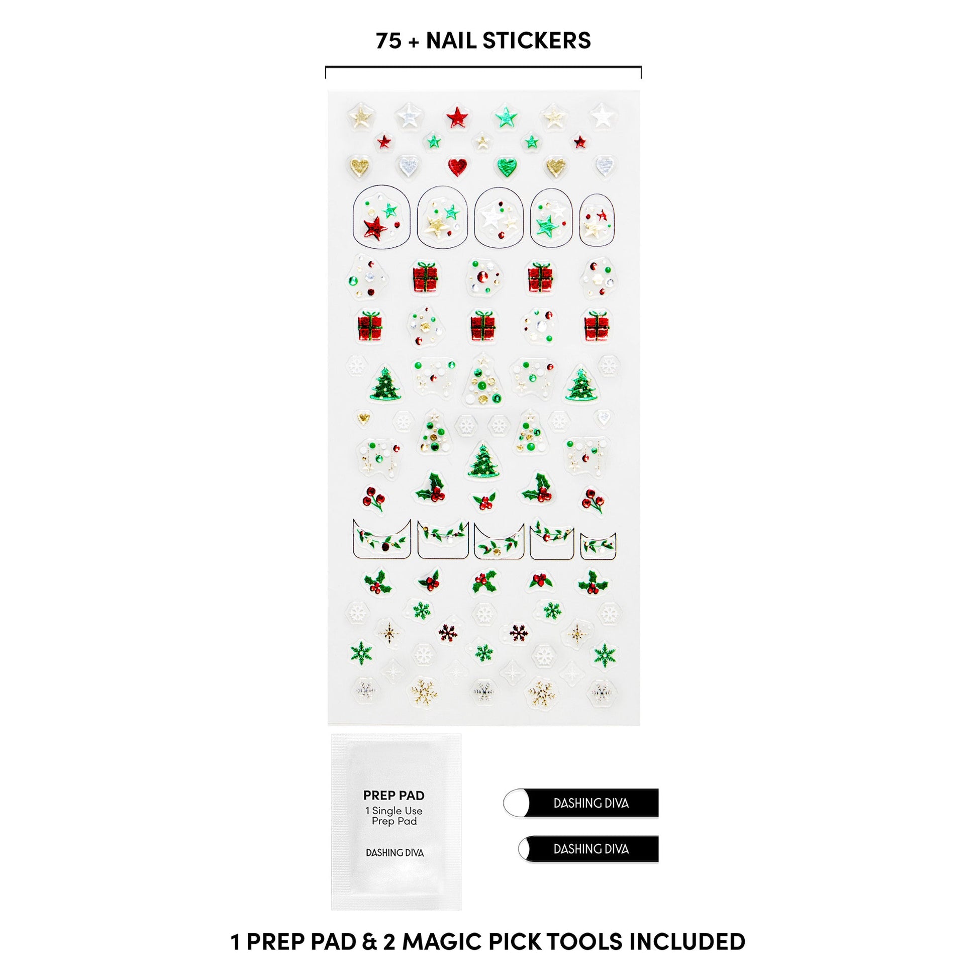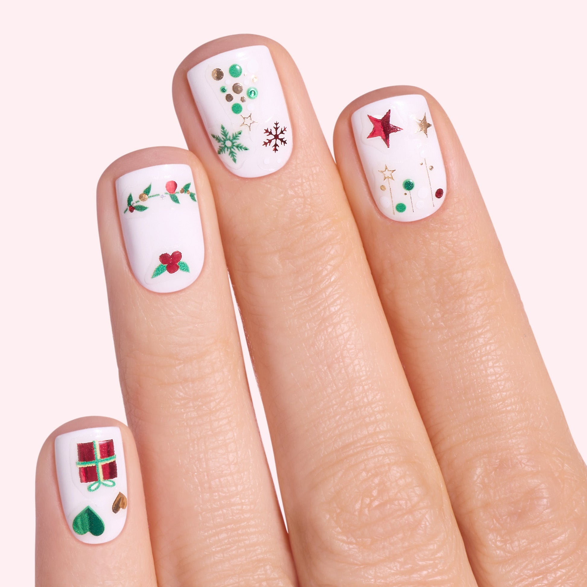 Premium nail art stickers featuring metallic gifts, trees, stars, hearts, holly, snowflakes, and more!