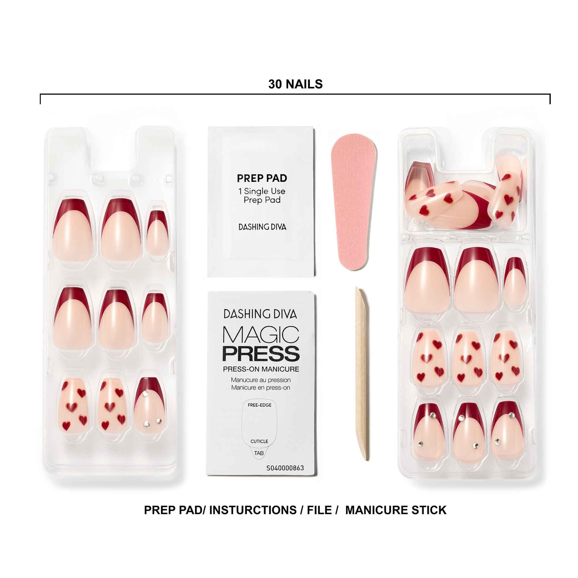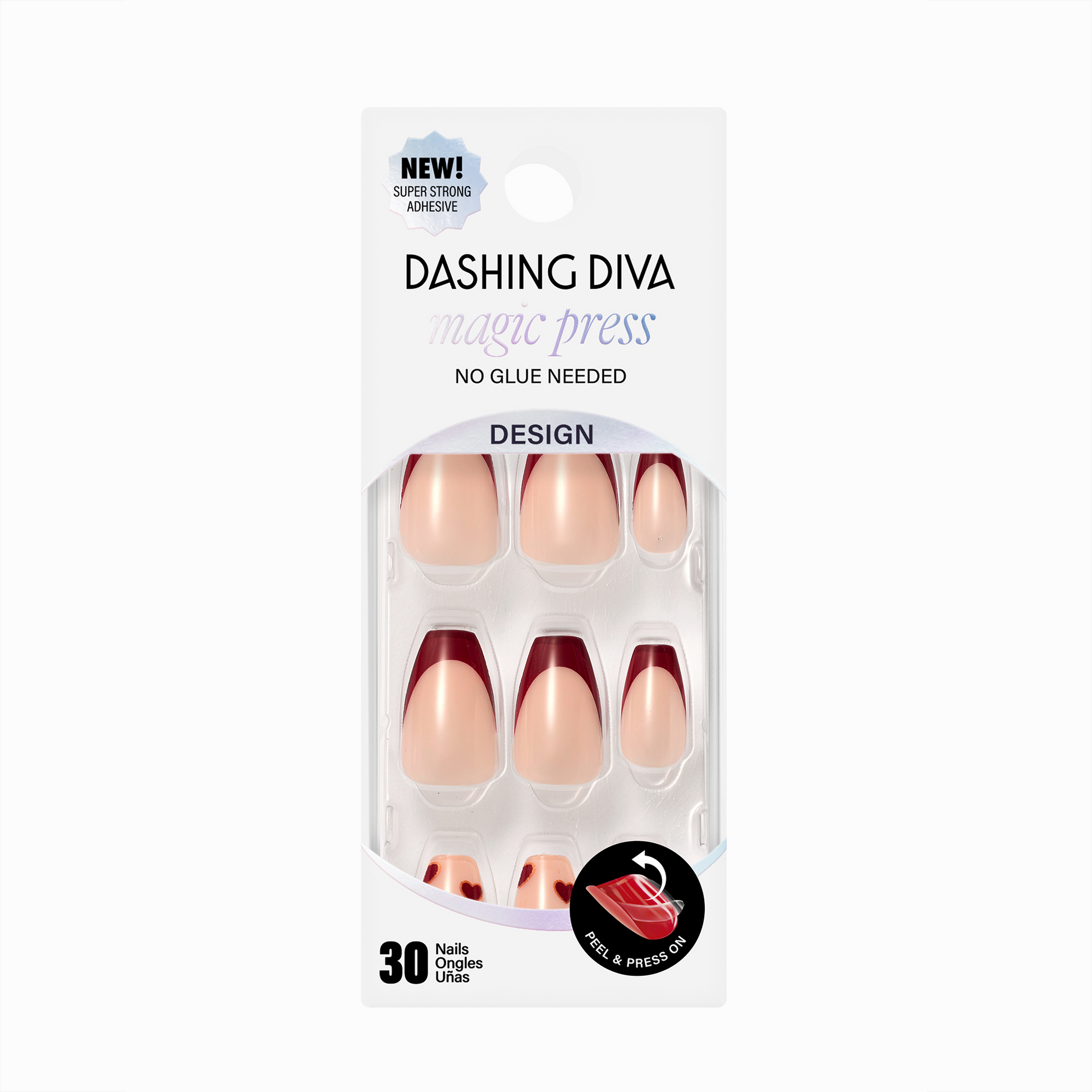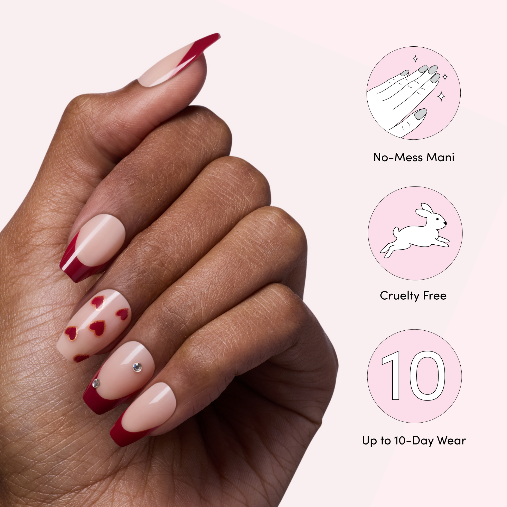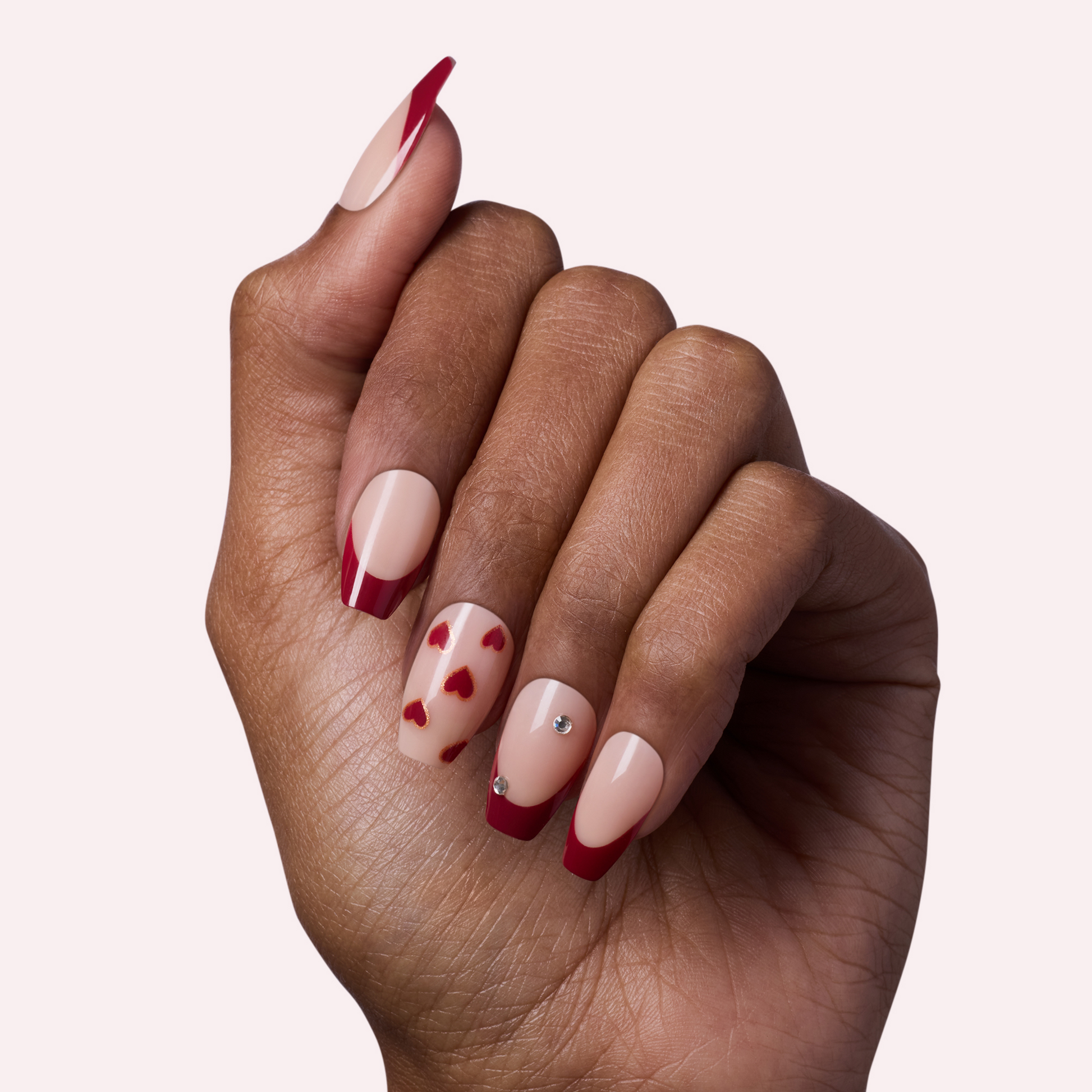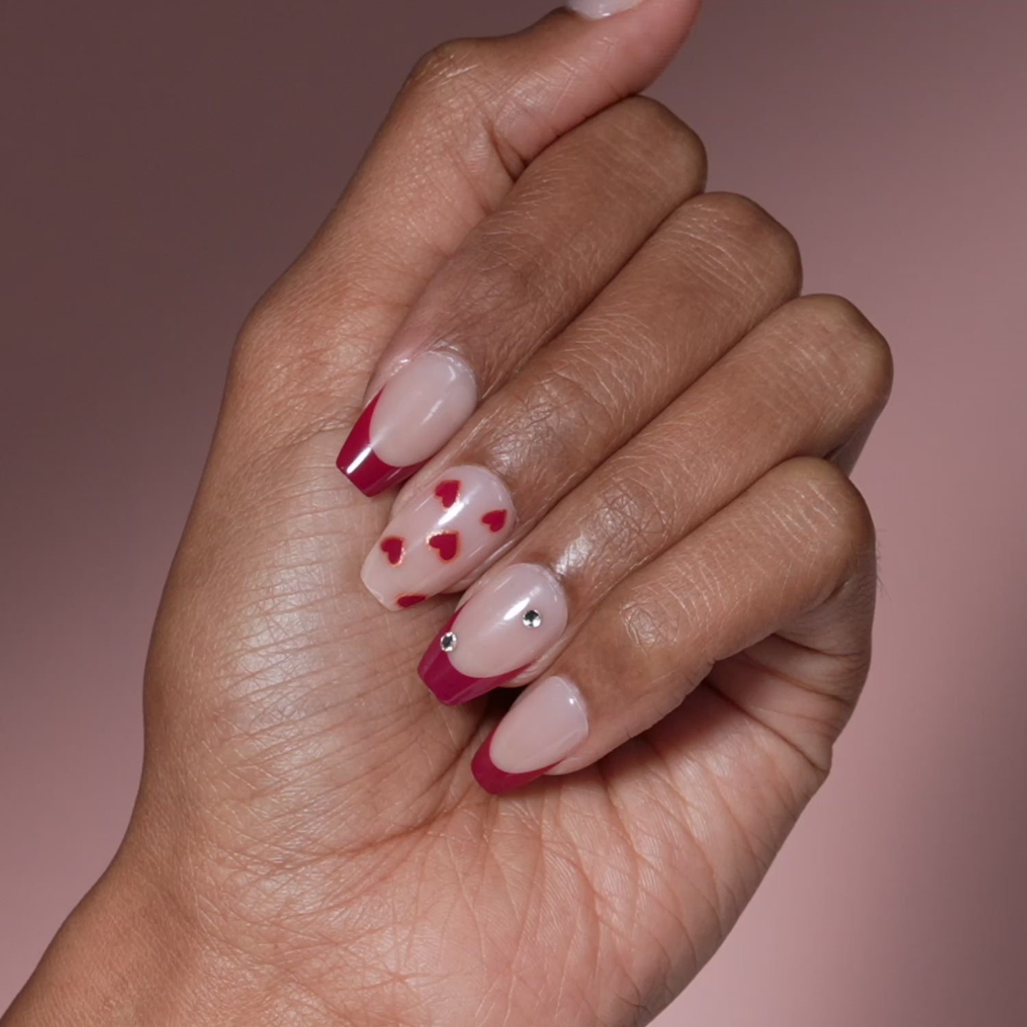 Burgundy tips, hazy hearts, and single rhinestones make these long nudish blush coffin-shaped press-on nails completely killer.