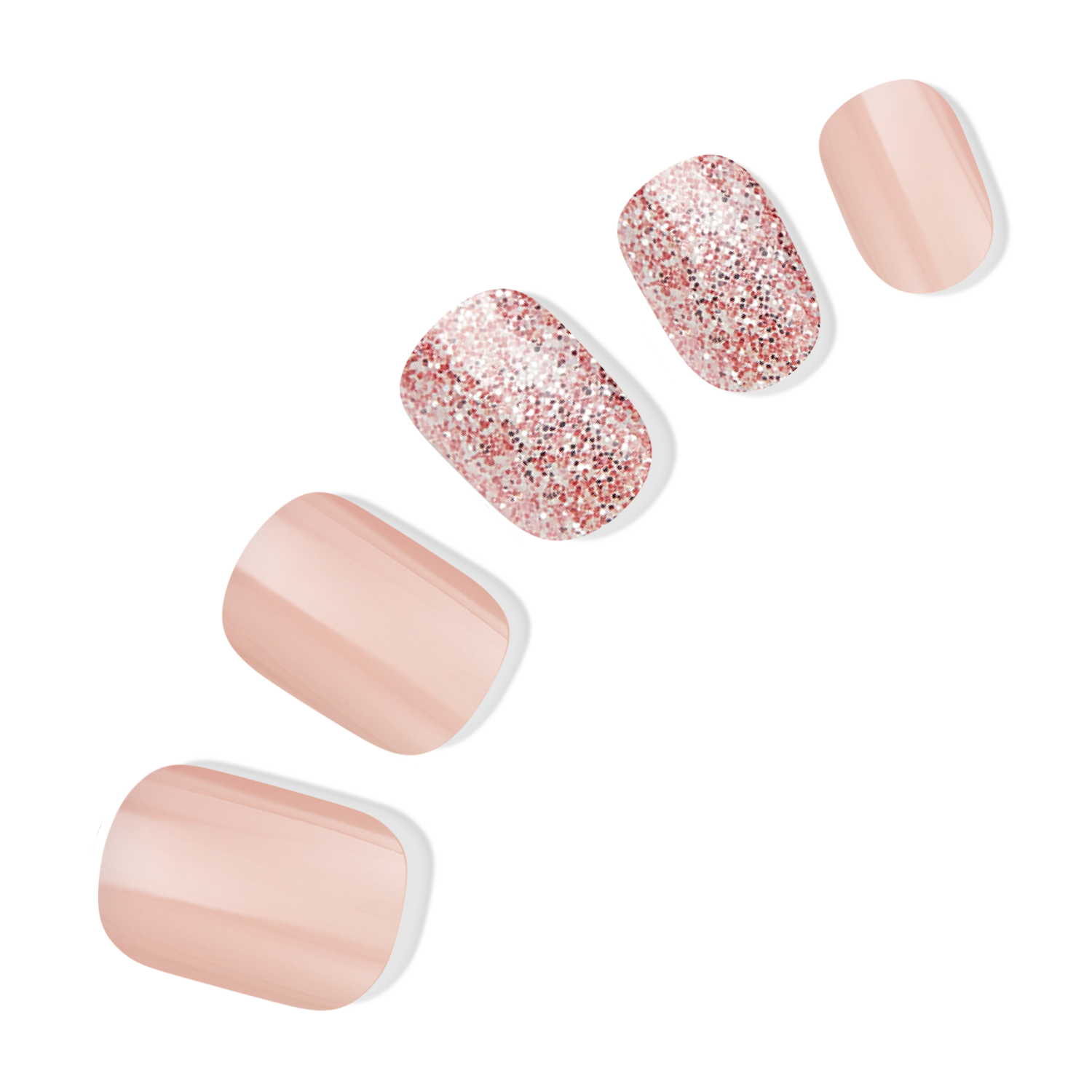 Soft tan press-on gel nails featuring rose gold glitter.