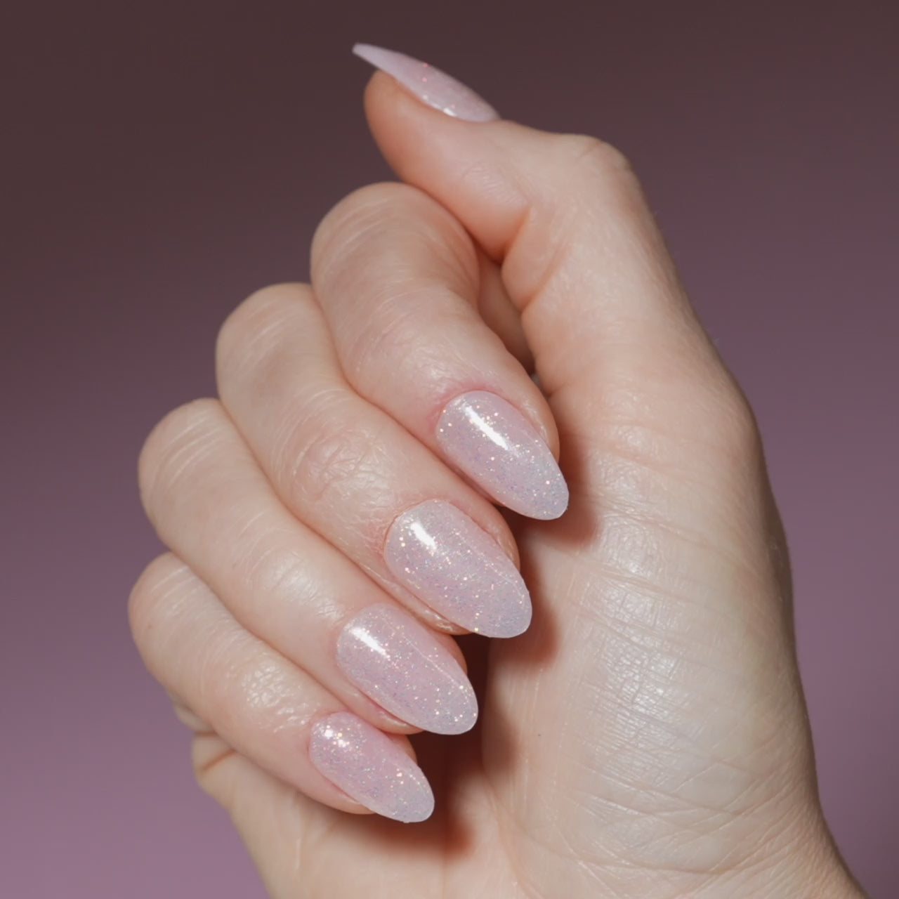 White-to-pink ombré press-on gel nails featuring iridescent glitter.