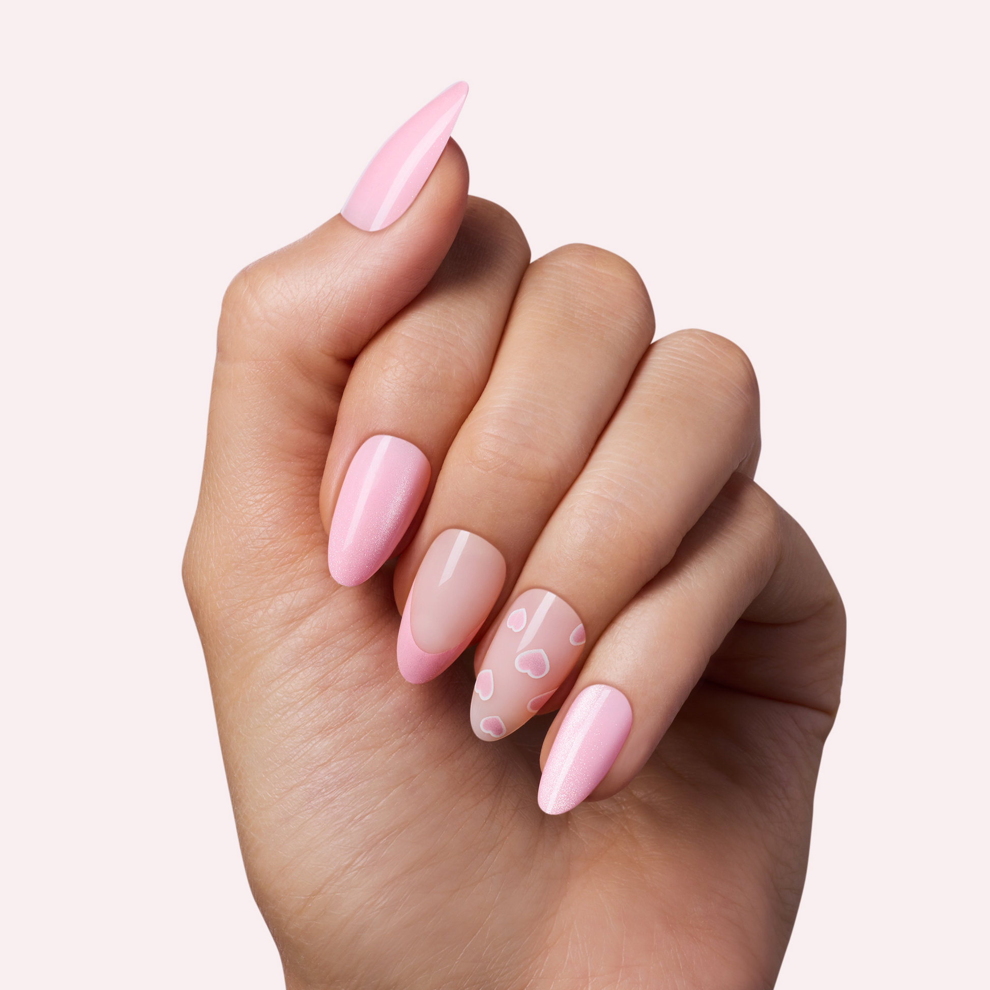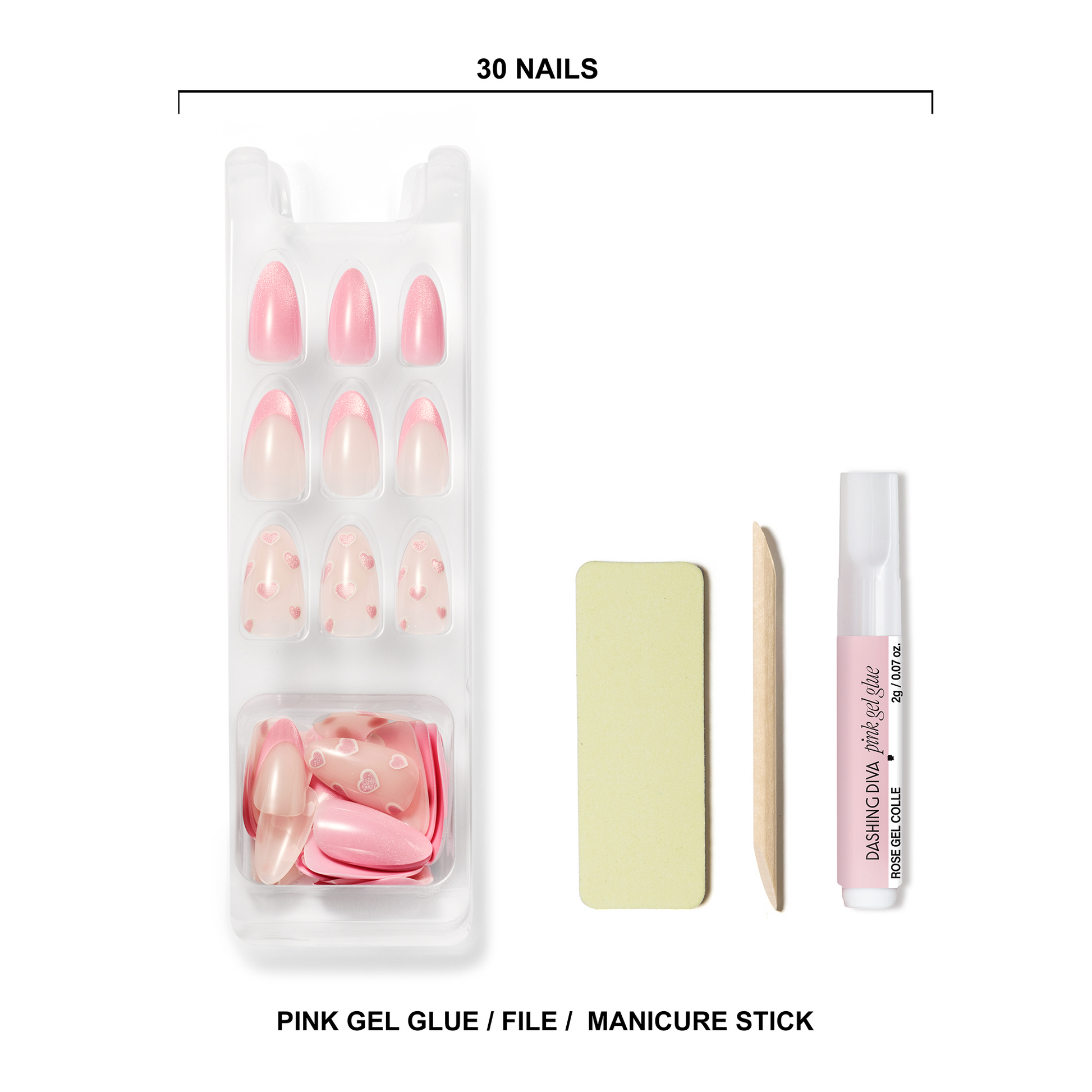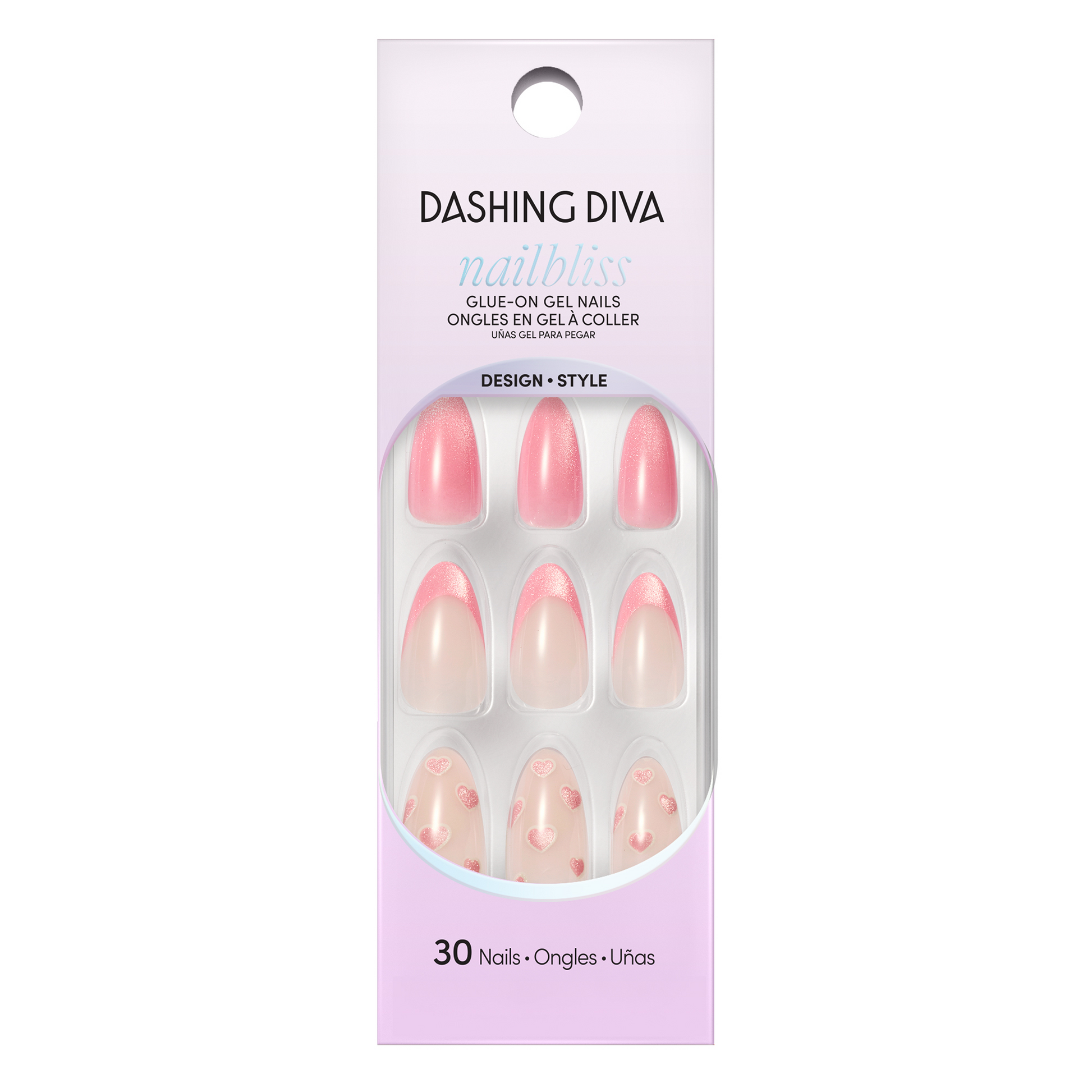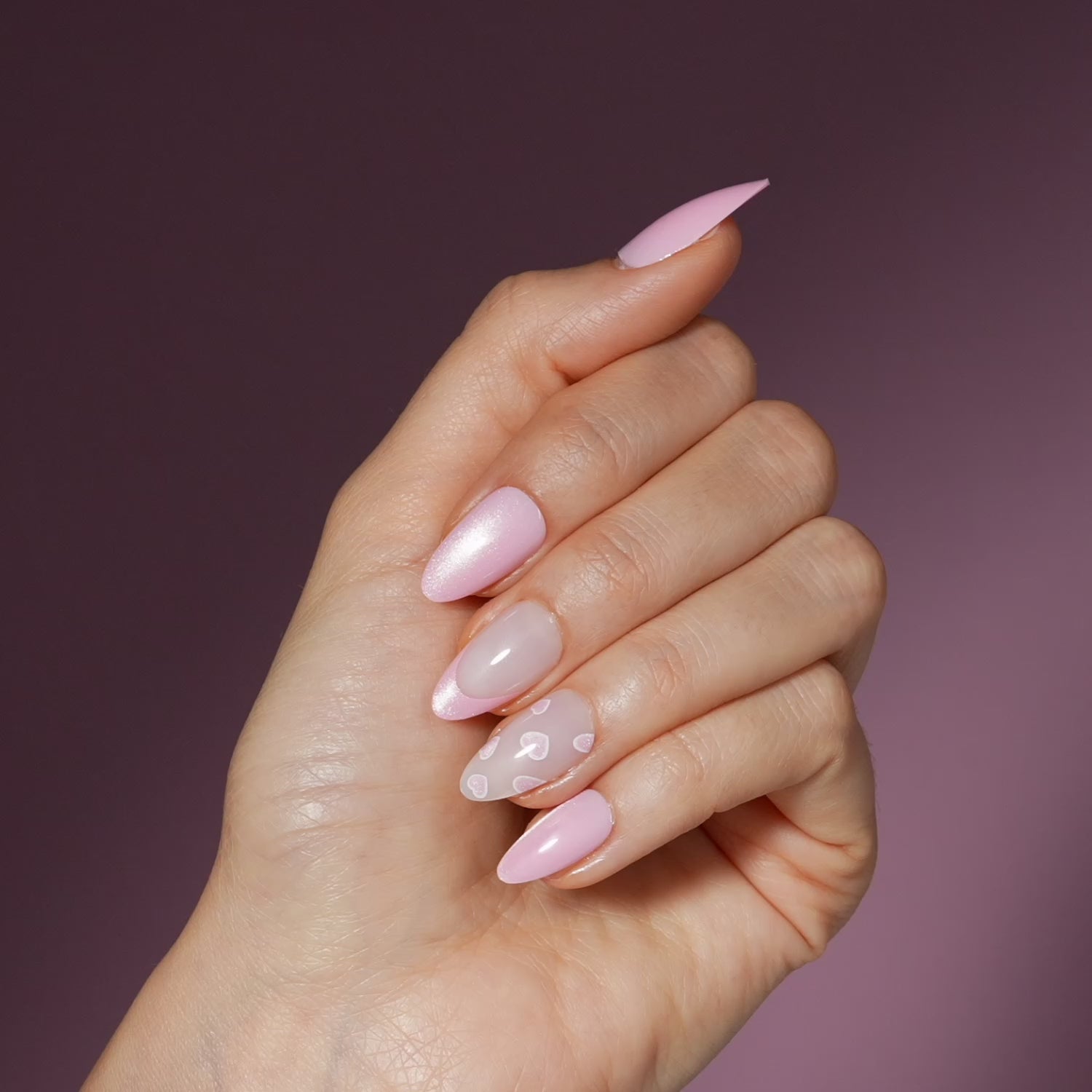 Medium length, almond shape, glossy finish. Semi-sheer ombre plum-to-glittery plum glue-on gel nails featuring single white hearts.