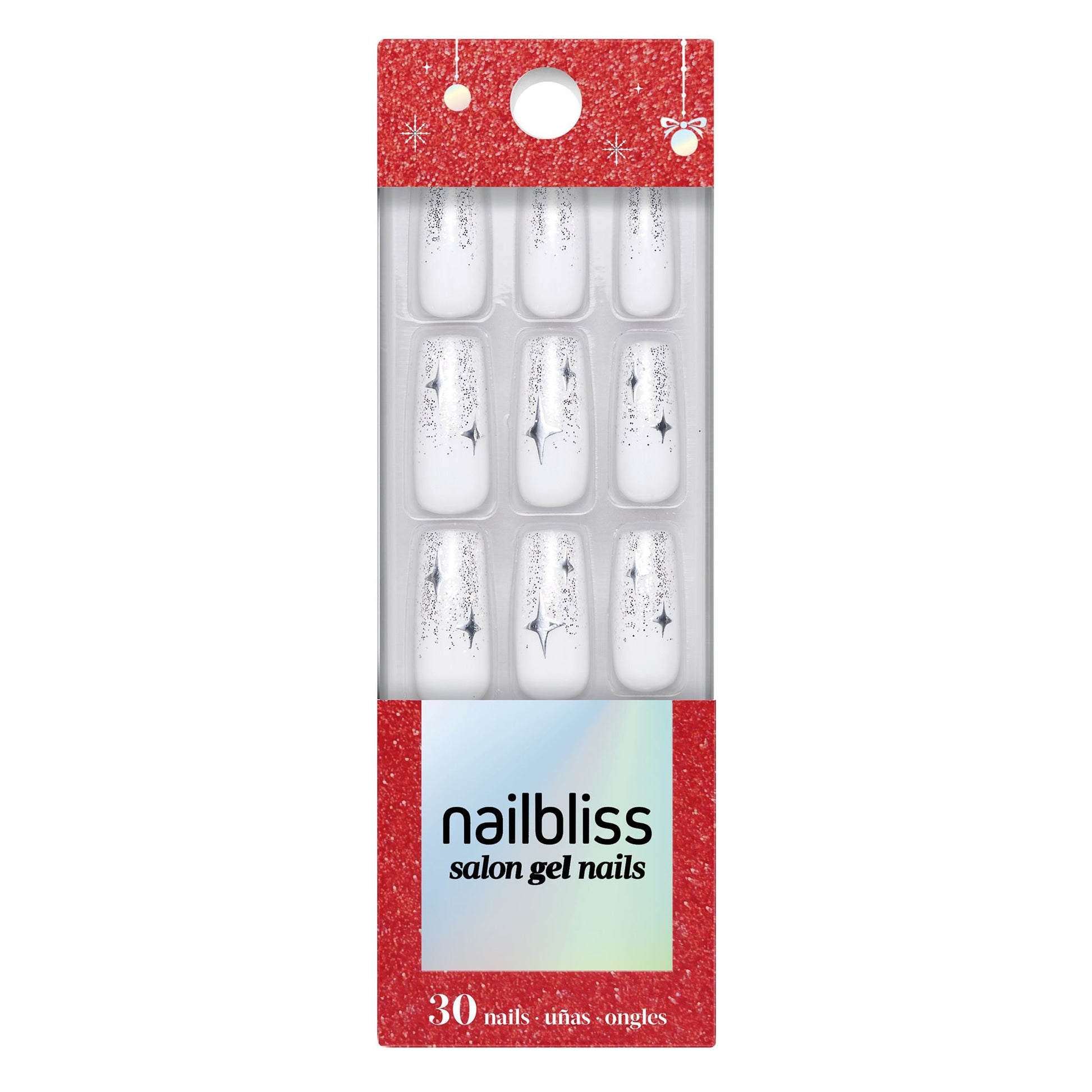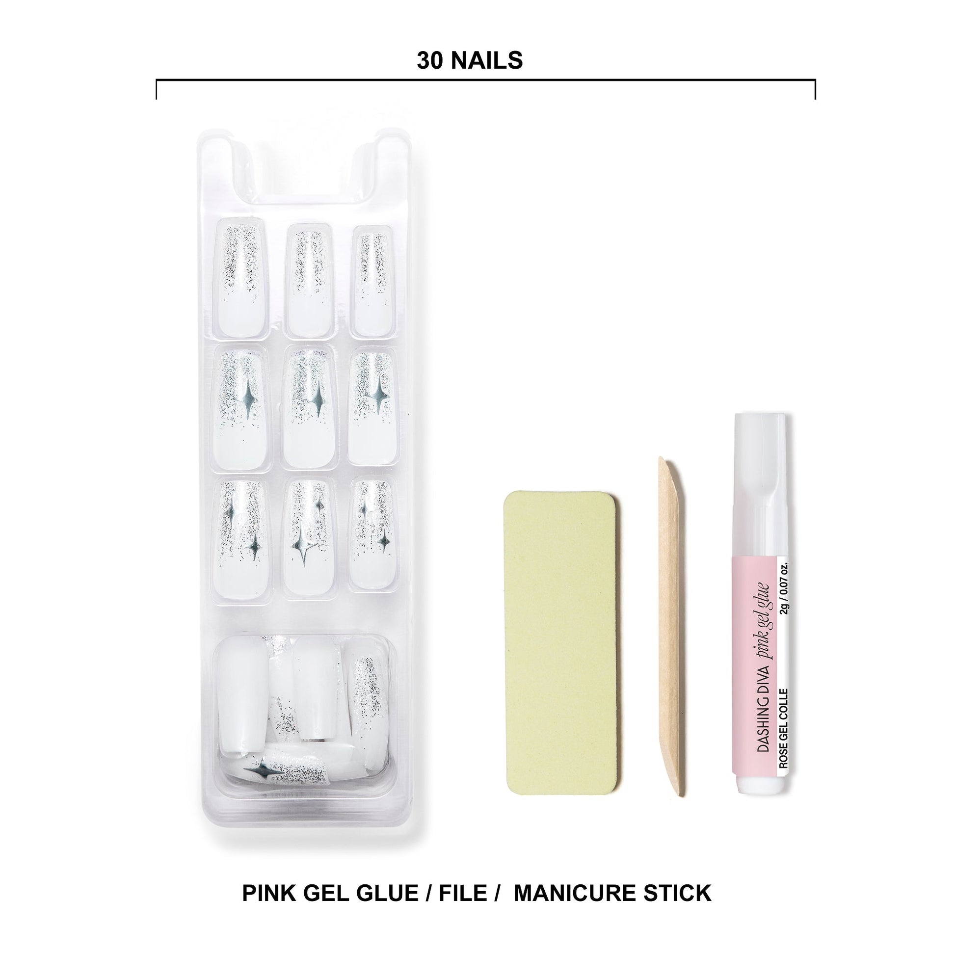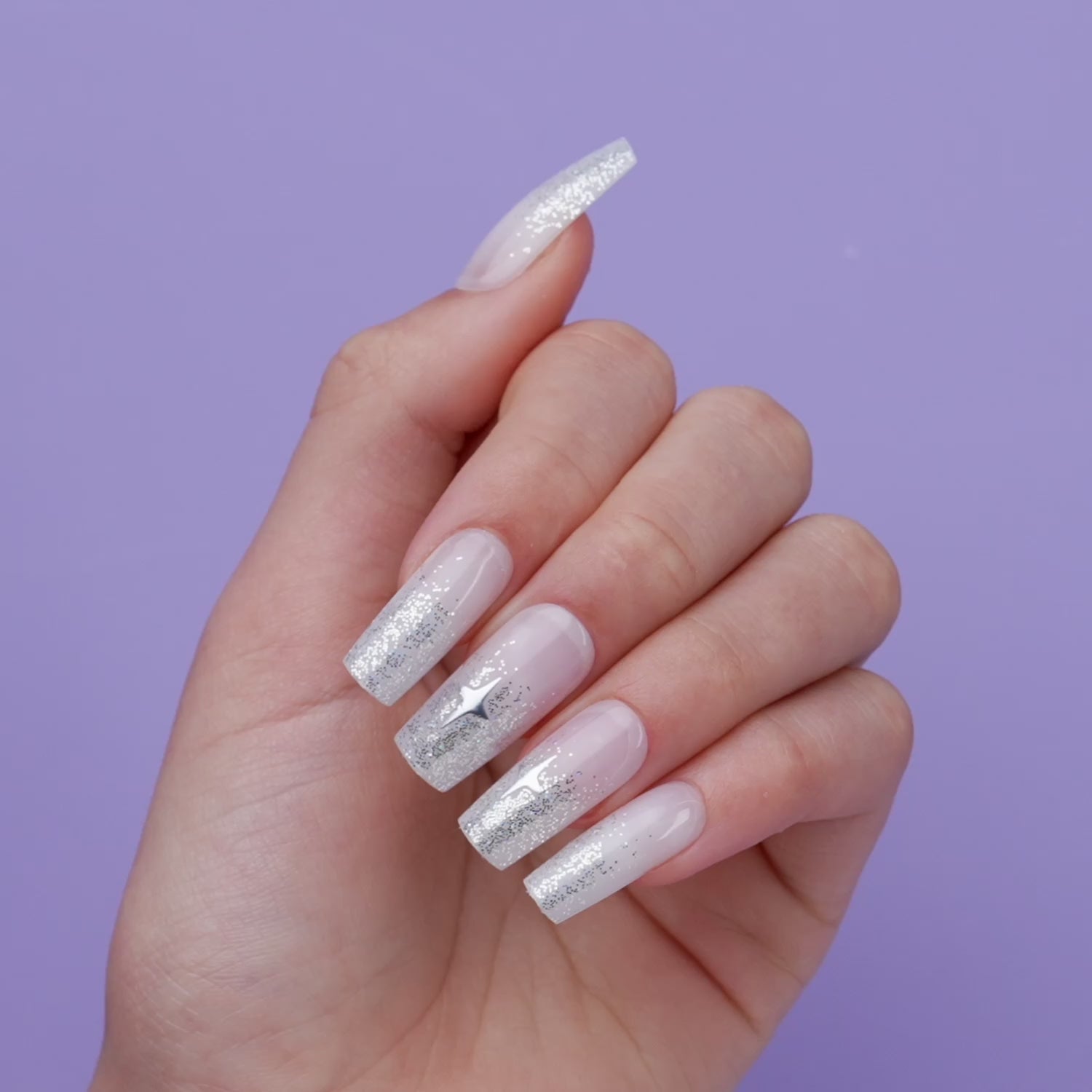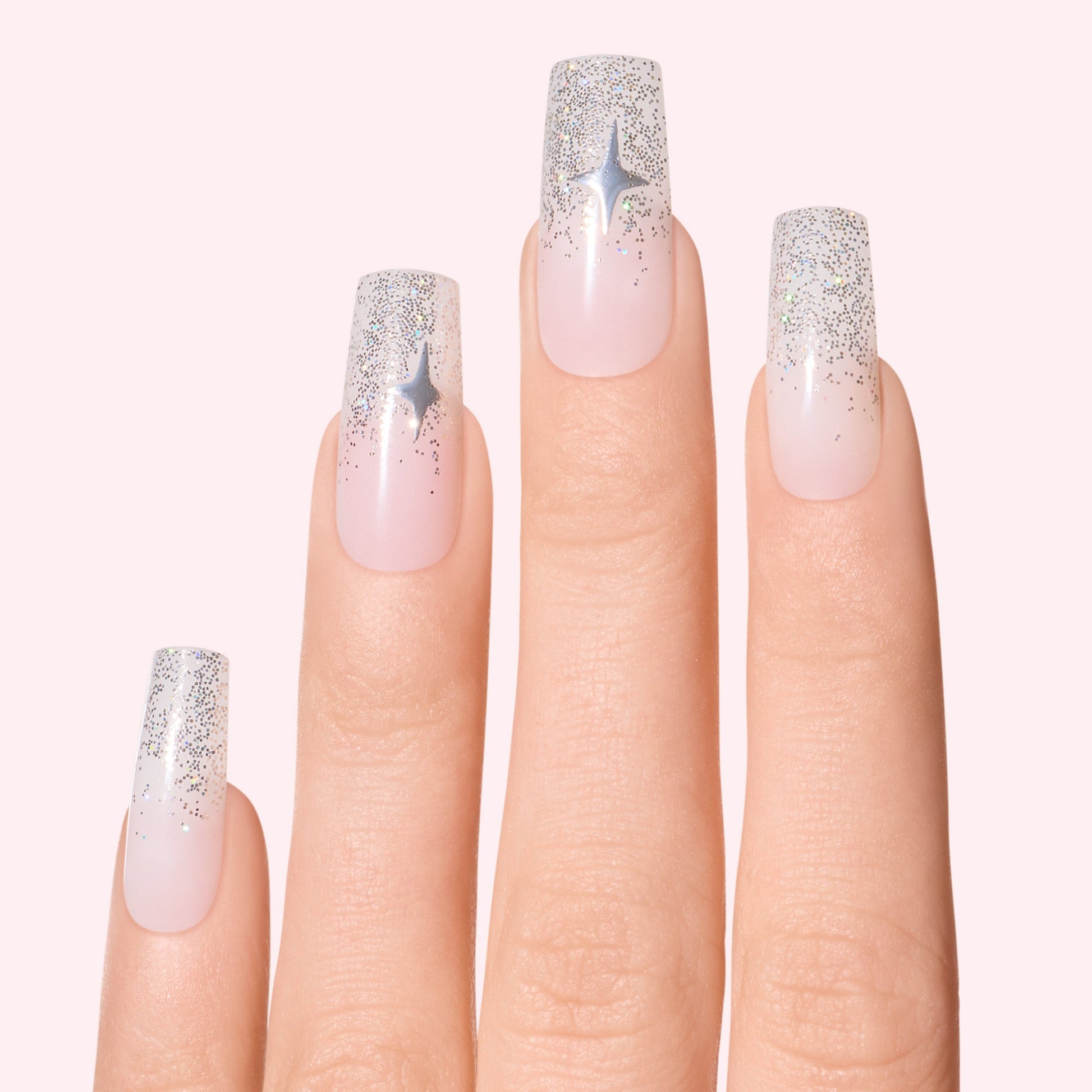 Long length, square shape, glossy finish. Semi-sheer white glue-on gel nails featuring metallic stars and ombré silver glitter tips.