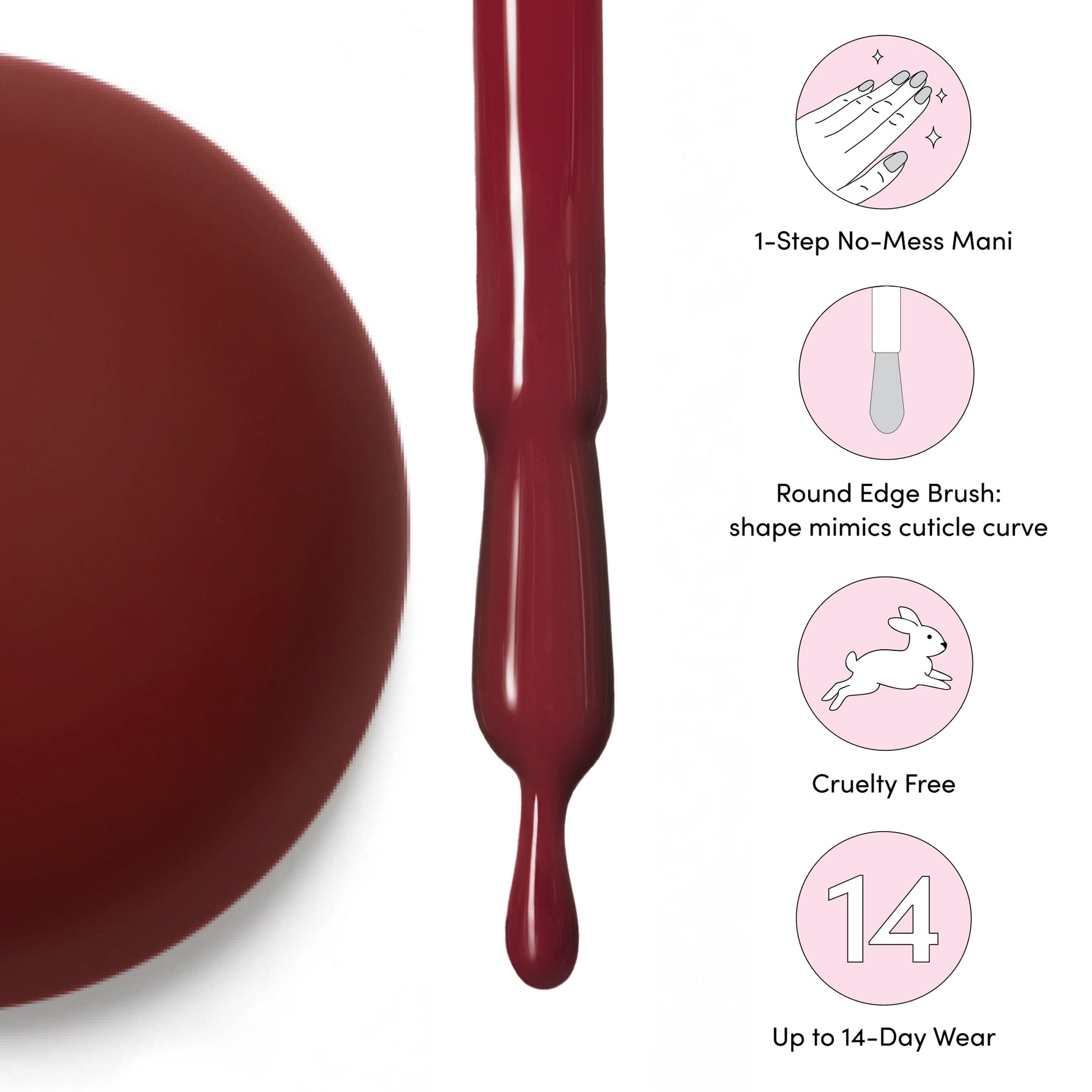 Semi red, fully sweetened. A rich 1-step solid clay red gel nail polish that delivers a flawless all-in-one base, color, and topcoat for a salon gel shine that lasts up to 14 days. Easily removes with our One Gel Magic Off Remover Kit, sold separately.