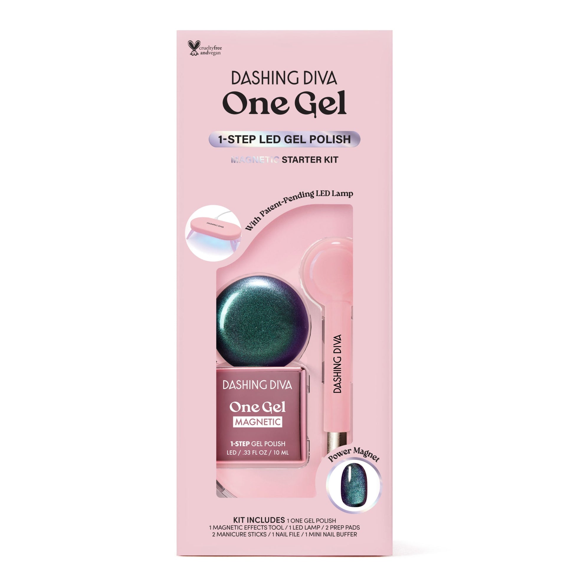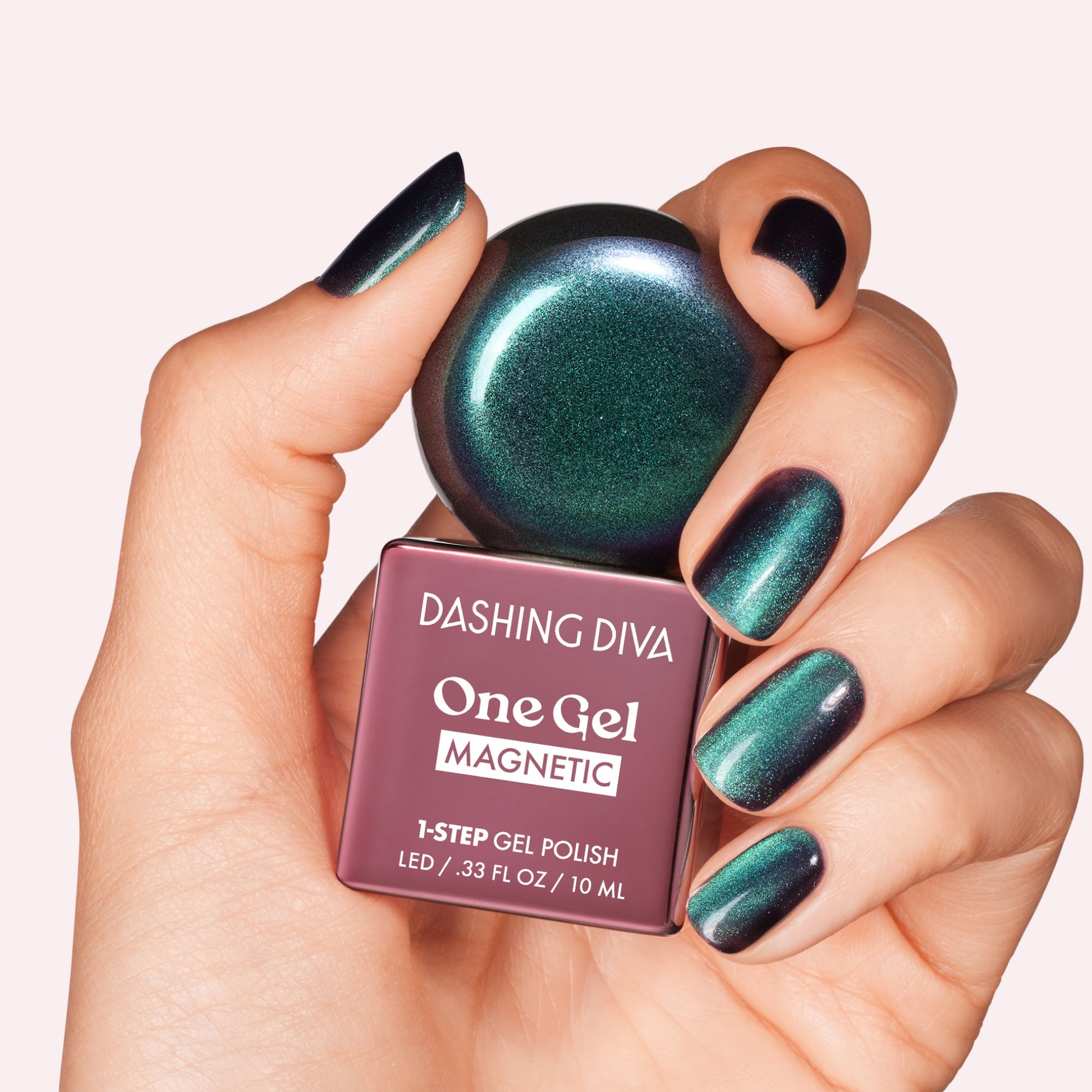 The effects go crazy… A 1-step iridescent teal/indigo gel nail polish that starts off shimmery and transforms into a magnetic finish once activated with our magnet tool. Easily removes with our One Gel Magic Off Remover Kit, sold separately.
